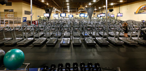 這是健身房進門的大廳﹕充滿各式各樣的運動機器。10架電視高高掛在上頭﹐可選擇看新聞﹑CNN或是運動頻道。