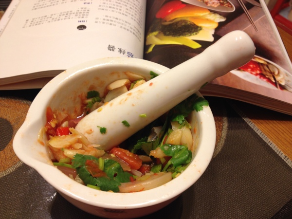 我的搗缽太小,只能分次搗;而且紅葱頭、蒜頭烤得不軟軟透,下次改進。另外,我推估小蕃茄應該是太甜了,下回得想想辦法去找找哪兒有酸味重一點的(好像有點難度^^)