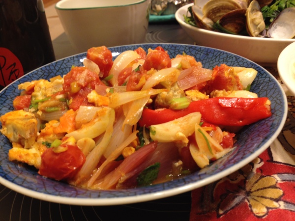 早餐剩下的蕃茄蘑菇蛋,加蕃茄辣醬再一起炒過:絶配!