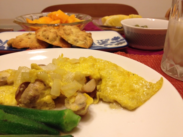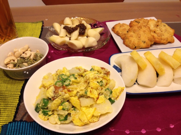 星期五晚做用現成的燕麥早餐穀物做了餅乾;另外本來是要用山藥及秋葵做歐姆蛋的,結果一個不小心忘了翻面,索性變成炒蛋;還用上星期磨的花生芝蔴醬淋上筊白筍;加上自己釀的檸檬醋;水果則有水梨及鳳梨。這樣的早餐是希望讓星期六早上下班回家的老爺子吃了能趕走外宿的疲憊喔~第二天還是蛋料理~加的是蘑菇,水果是鳳梨及芒果~這樣的早餐是希望讓星期日還得加班的老公能有滿滿的能量。
