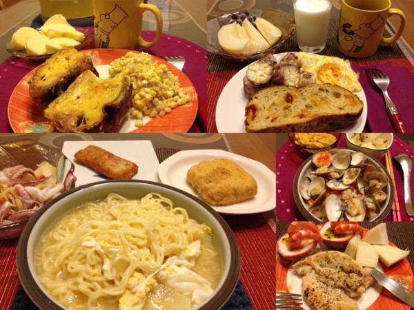 第一天中午拿出了婆婆給的,慈濟的米飯料理包。先將胡蘿蔔及洋葱切小丁加水煮滾,按著指示加入乾燥米,另外加了蛤蜊後蓋上鍋蓋悶上幾分鐘, 這樣叫做蛤蜊蓋飯嗎?晚上用洋葱熬了一會兒湯,再加入日本泡麵,打了個蛋花。這二餐雖然用的都是速食包,但都捨去裡面附的調味包,因為胡蘿蔔、洋葱及蛤蜊都夠香甜,只要再加一些些鹽就行了。配菜都有我近來很喜歡的「名豐炸豆干」,只有加蒜頭油膏就香得不得了,豆香味十足,貴得有理!另外想把家裡的雞胸肉處理掉,用香料稍為醃一下,再配上當天買的鮮蝦、百香果及筍子,也是輕爽無負擔的料理喔!