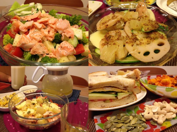 二姐每年都送來台北的一箱愛心麻豆柚,絶對是老欉無誤。搭配蝦仁、蘋果;另一餐則是加小黃瓜及蓮藕,淋上的都是用芥茉籽調的沙拉醬,簡簡單單就很有飽足感,而且證實柚子果真是很好處理的沙拉食材呢。另外,用家裡剩下的南瓜拌了堅果及新鮮蘋果,搭配清爽蔬果三明治;再來就是一次買了不便宜的鮭魚排,蒸過後大器地拌成沙拉,也是營養滿分的早餐!