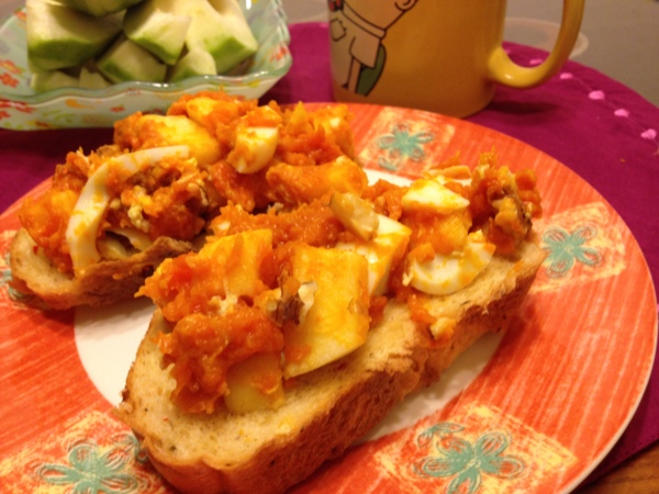 星期六早餐自己吃,主要是上星期剩下的上城辣椒麵包,擱在冰箱二星期的南瓜蒸一蒸,加了水煮蛋、蜜蘋果及核桃拌一拌,別說美乃滋,連橄欖油都沒加,但這樣搭起來真的是好吃極了。