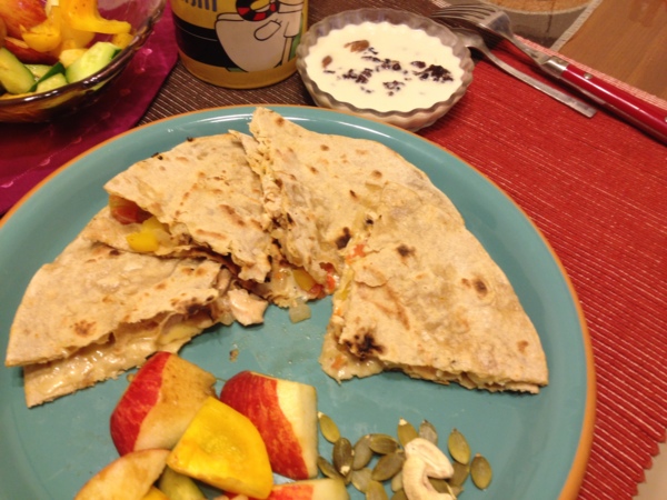 星期日早餐把老早前老爺子特地去台北市一家專賣印度菜食材及雜貨的店,買的印度餅來佯裝是墨西哥烤餅(下回再來網尋一下二者到底有什麼區別),炒了雞胸肉、洋葱丁、番茄丁、黃椒丁,放上也是買了好久的起司片一起當夾心。這樣不知道要叫什麼~另外因為上星期煮了太多的黑糖紅豆糯米,吃得好膩,就用去Costco買的大桶鮮奶做了奶酪趕緊消化掉。這樣亂搭一通,也算是甜點啦~