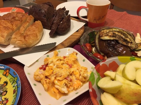 再回到早餐。我花了一些時間有耐性地在烤盤上烤著櫛瓜、茄子、蕃茄、茭白筍。幸好二位都買帳。我想,新鮮食材,簡單料理,真的不用太強調調味(我只加了鹽及橄欖油)。另外想說的是,麵包是用我新入荷的日本製,但便宜到不買就對不起自己的麵包刀切下的…好感動…從來不知道使著麵包刀是如此輕鬆寫意啊…(嗯,我承認有些誇張啦!)