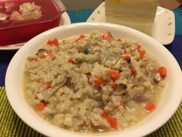 其實不算花太久的時間呢,後來又試作一次,主材料換成杏鮑菇及蛤蠣,尤其把事先煮蛤蠣的湯汁也加進去,味道更鮮美!甜點貪心地買了蛋糕及自己做的洛神花凍加白柚(其實洛神花凍中還擠了金桔…還真是隨便又隨意啊…)