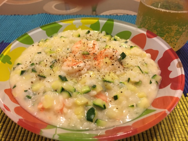 先將米泡上一會兒,炒香洋葱(有加了一些奶油),切成丁的櫛瓜稍為炒軟,再下米,高湯分次加。看著米粒都應該都吸飽了高湯也變軟後再加入蝦仁及cheese,就大功告成了~