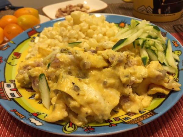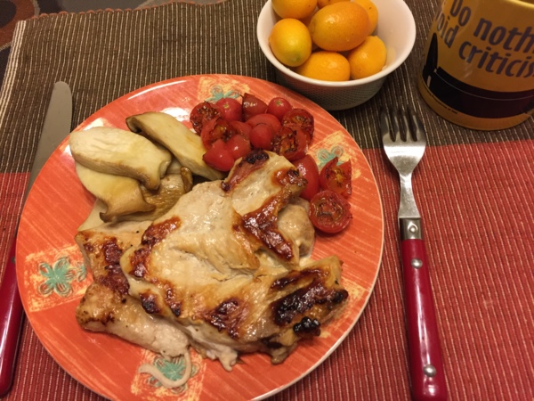 牛奶玉米是跟市場大姐買的,鮮甜極了,但炒二個蛋實在太多,有點膩。另一餐是早在冷凍庫好久了的雞胸肉,用烤盤一起烤了杏鮑菇及小蕃茄,快速又方便!