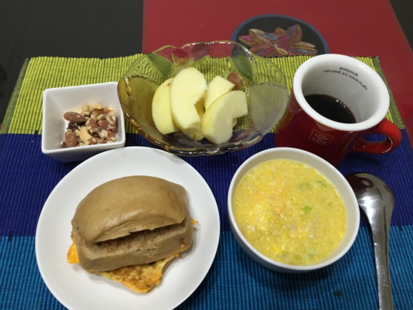 上次回去探望住高雄煉油廠區的舅媽,給了我們幾個鄰家媽媽一起做的手工饅頭,就煎了葱花蛋,到市場買了一百元據說還挺有名氣的海苔魚鬆來搭配。再跟市場大姐買好吃(但很貴~)玉米,現磨現煮玉米濃湯,特別的是有加DADA老師從印度帶回來的Ghee,就是她用來配合淨化法用的印度酥油,果真不一樣,一嚐就知道完全沒有人工香料。熱熱地喝自己做的香濃玉米湯真的很溫暖~咖啡則是這次從越南帶回來的。