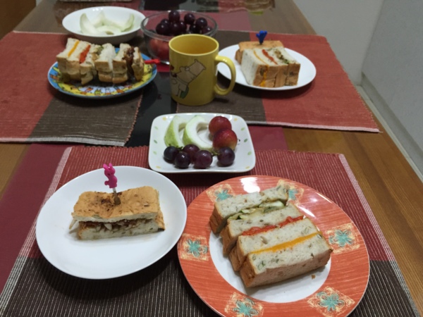 照片看不出來,但其中一個三明治其實是紅黃綠三色蔬菜。紅椒事先烤過後用balsamic 及窗台摘的百里香醃一晚,南瓜蒸爛搗成泥,當季的櫛瓜用平底鍋煎過。完完全全是素食,清爽無負擔,而且再簡單不過了!另一個三明治則是朋友送的培根及煎過用手撕成絲的杏鮑菇。水果還有著從武陵農場帶回來的蜜李,真不錯吃。