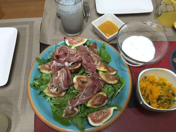 再來是帕馬火腿。頭一次跟也是高貴的無花果以及芝蔴葉送做堆做了沙拉。嘴巴愈癢愈刁的老爺一吃就說新鮮品質好,煮婦深感欣慰,不枉花了大把銀子買這種餐廳才用的進口食材。芝蔴葉及無花果都是台灣自己種的,但由於量少,價格自然也不太親民,也就是嚐鮮罷了。第二次是哈蜜瓜,也稱得上不是太便宜的水果。火腿和水果搭配得天衣無縫!