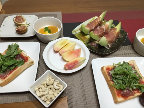 自己熬的蕃茄醬, 自己做的芒果果醬.....加上各式帕馬火腿,芝蔴葉、水蜜桃、無花果等高貴食材....這早餐真的很有看頭.