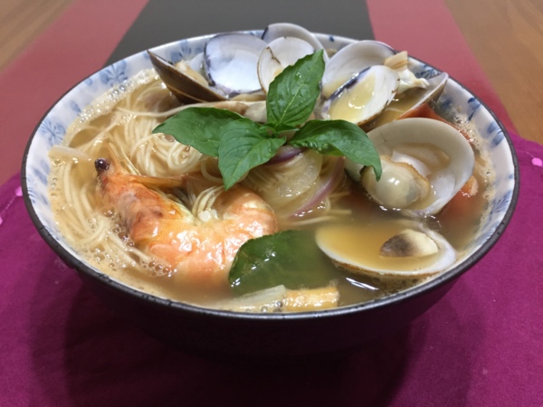 朋友去中和(永和?)買的泰式酸辣湯的調味包,放在櫃子都半年了,加了些新鮮的香茅及檸檬葉,熬了一會兒,加上滿滿的海鮮料,擠了顆檸檬,就差沒有放辣椒:真的是泰式酸辣湯喔^^