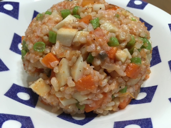愈來愈習慣吃糙米,而最近的早餐都在家裡吃周末準備的炒飯,所以也得多些變化才行,不能老是用偏油了點的松露醬。這次用的是自己熬的蕃茄醬,可以加進去的菜色多的是囉:毛豆、四季豆、玉米、胡蘿蔔、小玉米、甜椒、各式菇類或筍子等。