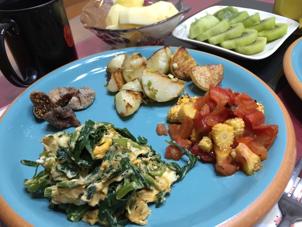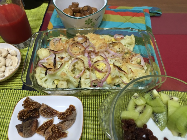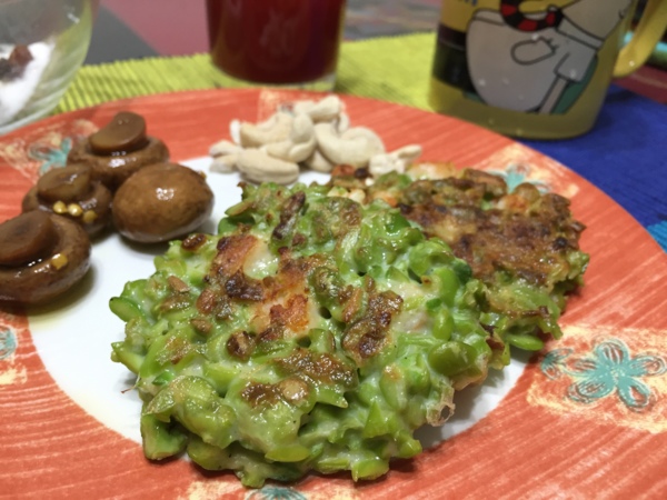 好久好久沒有做二人早餐,自然也沒有時間上菜場。翻出冷凍庫的常備品,就湊和著吧~買來的一大包毛豆,通常都先燙熟了,分成一包包的凍著。白蝦也一樣。這天福至心靈,把毛豆及蝦仁稍微剁碎,和進了顆蛋及麵粉。煎得「恰恰」,還挺香的,也很有飽足感。另外準備了同學推薦的瑞士進口果菜原汁,還有自己很喜歡做起來以備不時之需的油漬蘑菇。另外,白花椰菜好大一顆老用不完,炒了白醬加了點快過期的起司粉來焗,也是一餐啦~