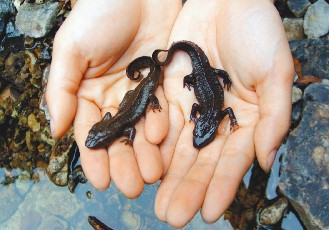 廣東東莞觀音山森林公園工作人員本月九日,在森林公園附近小溪岩縫中發現兩隻恐龍時代的古珍稀動物「中國小鯢」。