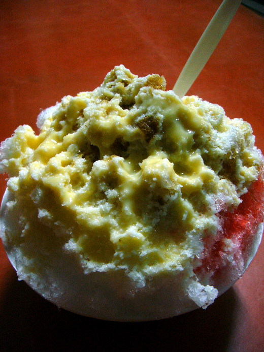 從這刻她成了現場人心目中的刨冰女王,多麼性格啊,當她認為一碗刨冰要達到完美境界,就一定要加煉乳時,不由得你要不要,她說要就是要。於是,我得到了一碗淋上美麗煉乳的刨冰。同行的替代役的冰更是高得快塌下來,「他的冰怎麼這麼多啊?」老闆娘說,「男孩子多吃點呀。」好像當成炒飯賣。