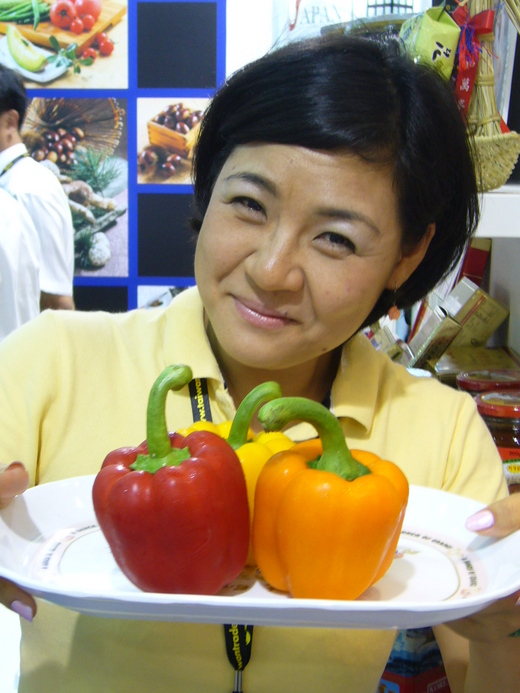 往年韓國館多為柚子茶、海苔或泡菜等加工食品,不過今年多了哈密瓜、甜椒、杏鮑菇等新鮮食材;韓國農協負責人鄭光泰表示,現在韓國有半數彩椒均外銷到日本,因此也想開拓台灣市場,另有外型像紅蘿蔔的小彩椒,外型討喜,詢問的人潮不斷,一公斤約300元台幣;另有走精品路線,產自韓國慶南的「網子哈密瓜」外觀渾圓、肉質柔軟鮮甜,市售價約百元,也很受歡迎。
