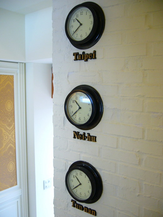 小歸小,但從進門起的每個角落都呈現獨特的興味。一樓的吧台可邊看電視運動節目、邊喝特調飲料,暗紅色的情人卡座也別有風情。往裡走到底,晨光輕灑入室內,有室內的優雅又有室外的自然柔和。樓梯口掛了三個時鐘,分別標上台北、內湖和敦南,顯示「零時差」的趣味。