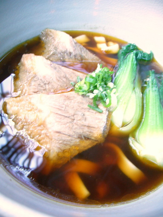 看到這碗牛肉麵,首先會讓人忍不住「哇!」兩聲--幾乎所有來客第一印象「哇!碗好大」,如喇叭狀的灰色碗身,有差不多20公分高;再來是「哇!牛肉好大塊」,這三塊牛肉在碗裡頗有架勢,與一般牛肉麵使用的牛腩、腱子肉不同,選用的是美國Prime級的美國無骨牛小排。