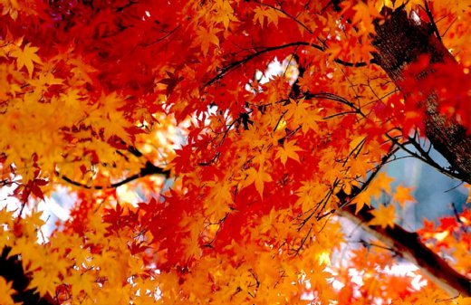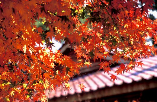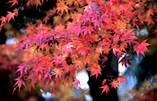 看著幻燈片,心頭的激盪仍與那日上山乍見滿樹火紅的景象時相同.而布幕上艷麗的紅葉,深深震撼著我的心.幕然間,好似有一陣風襲來,枝葉隨風搖擺,紅葉飄落紛飛,彷彿身著艷紅舞衣的舞者,在盡情的舞蹈時所揮灑出的迷人舞韻.