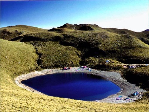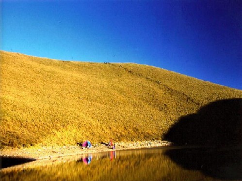 湖邊周圍是和緩的草坡,可以爬上高處,欣賞映著藍天白雲的湖光山色.