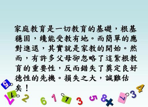 家庭教育是一切教育的基礎,「好家教,才有好國民」,希望為人父母者,皆能用心教養自己的子女,不可偏廢。 ☆珂玭☆ 於 2010/08/30 22:17回覆 - 7樓.2010/08/24 02:21道不離生活