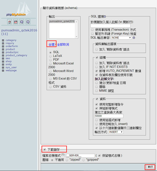 Step07 : 在輸出介面中 , 資料庫欄位下勾選”全選” , 再往下拉, 勾選”下載儲存” 然後點選”執行”按鈕 , 就能儲存資料庫格式 .