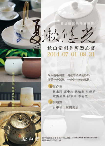 夏漱悠光~心情陶創作聯展 夏日蟬鳴,百花宴放,在炙熱的天氣裡如何靜心 午後的一場雷雨 洗去燥熱的塵囂 滌一壺茶  在濃濃茶香中 讓「人」與「器」之間發生細微的情感依戀 夏日透光的樹影 透露著晨曦的光,...