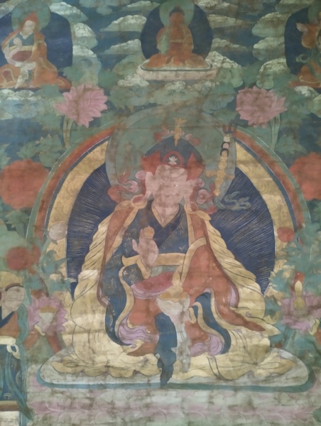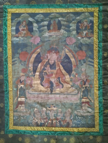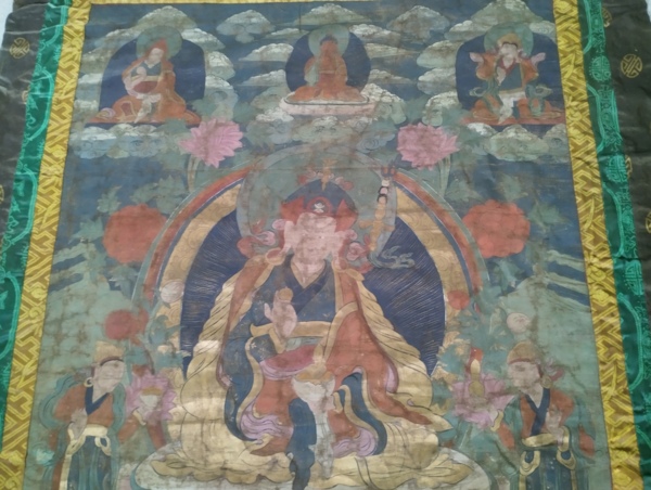 這幅畫跟著我到了美囯。在進大學教書前,我曾在美西最大的拍賣公司待過,了解藝術行情。在教藝術史的那七年,講到西藏藝術史時,會從畫筒拿出來獻寳,洋學生們莫不睜大眼,連連擧手發問。畫中央正是法力強大的蓮花生大士。