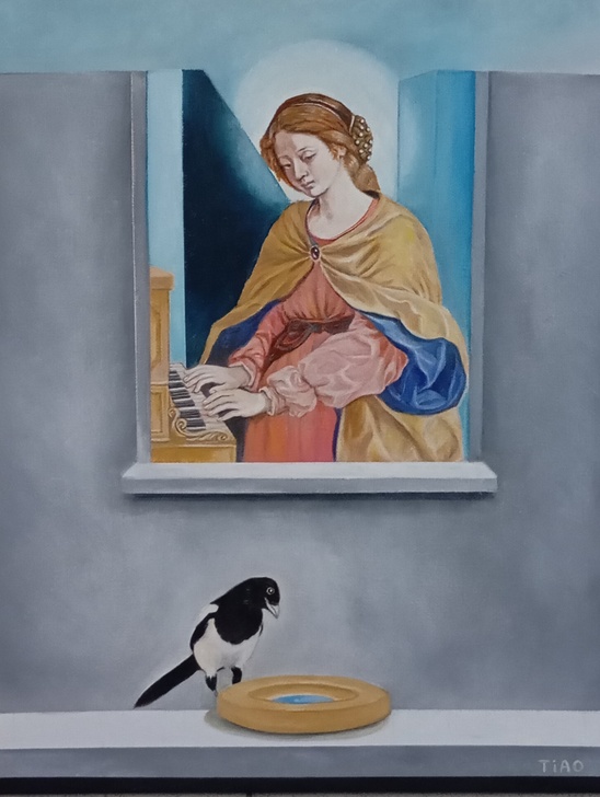 在這幅作品中,畫家以一種極為巧妙且充滿象徵意涵的方式,將觀者帶入一場關於時間、靈性與現實的視覺對話。畫面中,一位古典女子坐於窗內,低頭彈奏管風琴;而在窗外的現實空間中,一隻黑白相間的喜鵲正專注於水盤。這幅畫透過對比與交疊的畫面結構,邀請我們思索藝術創作中時間的流動、靈性的永恆與現實的瞬息。
