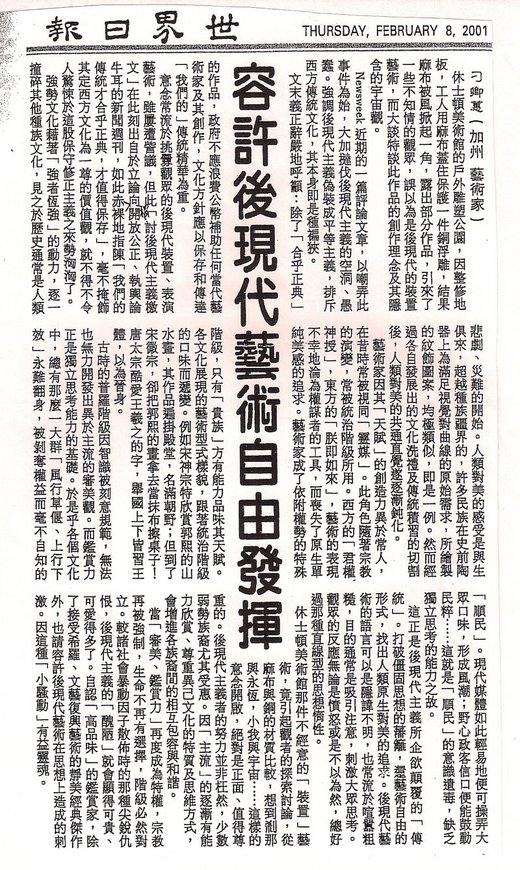 這篇九年前的文章,如今讀來,仍興味盎然。對於那些打著藝術家名號,把作品「說」得天花亂墬,實際上卻毫無天賦的傢伙們,雖有時也会皺眉,相當理解《新聞週刊》的那位作家的想法,但是卻不否定後現代藝術的存在價值與必要。這個世界有趣,就在於多元,不是嗎?