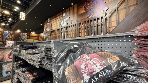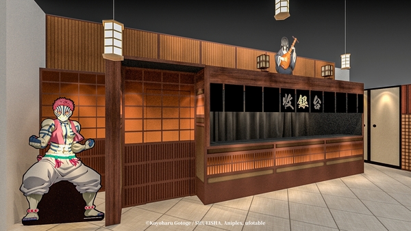 ▲以無限城進行設計的商售區,猗窩座的戰鬥姿態與坐鎮收銀台的鳴女