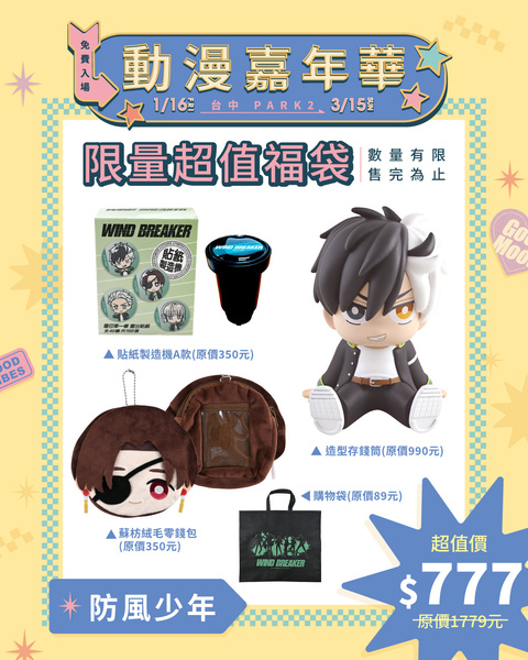木棉花與宅一番精心推出超值福袋,內含多款精選實用周邊與收藏商品,每袋只要777元,身為 粉絲絕對不能錯過!《進擊的巨人》福袋推出調查兵團刺繡托特包及角色人物書籤收藏組。《鬼滅之 刃》福袋收錄角色滑鼠墊與血鬼術眼罩。《膽大黨》福袋則帶來超可愛的高速婆婆頸枕組。《葬送的芙莉 蓮》福袋推出彩繪玻璃風格折疊透明傘。《WIND BREAKER—防風少年—》福袋推出櫻遙造型公仔存 錢筒。《關於我轉生變成史萊姆這檔事》福袋則收錄造型隨身收納環保袋。每款福袋數量有限,售完為 止!。無法親臨現場的粉絲,也可透過木棉花樂園官方購物網站、木棉花蝦皮商城,以及木棉花門市 同步搶購部分福袋(實際販售款式依各平台與門市公告為準)。