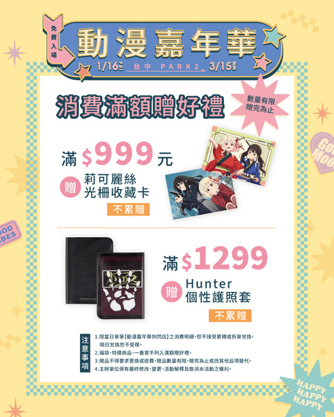 活動期間,全店消費滿999元即贈《Lycoris Recoil 莉可麗絲》光柵收藏卡,滿1299元可以獲得《獵 人 HUNTER×HUNTER》護照套(數量有限,送完為止)。現場推出專屬加價購活動,粉絲可用150元、 199元加購超值商品。活動期間,部分商品推出最低下殺100元優惠,優惠款式與數量有限,售完為止。