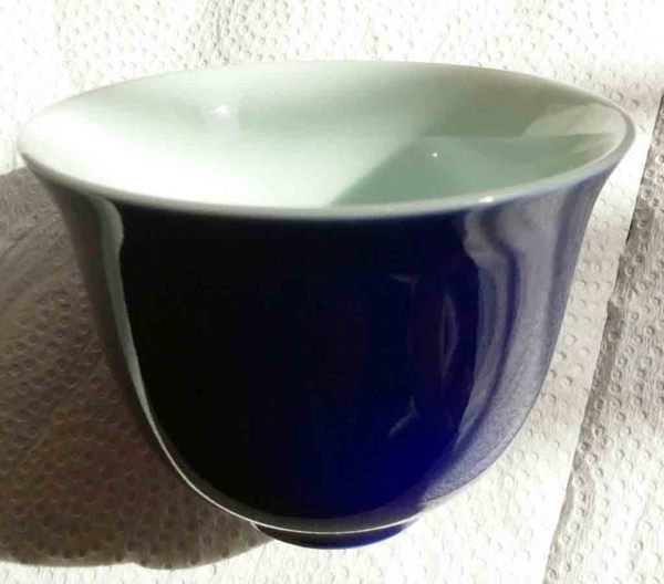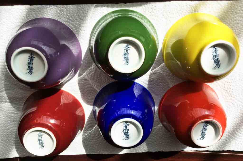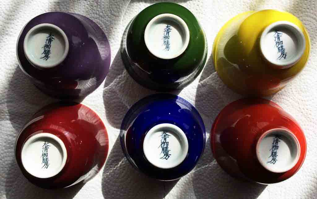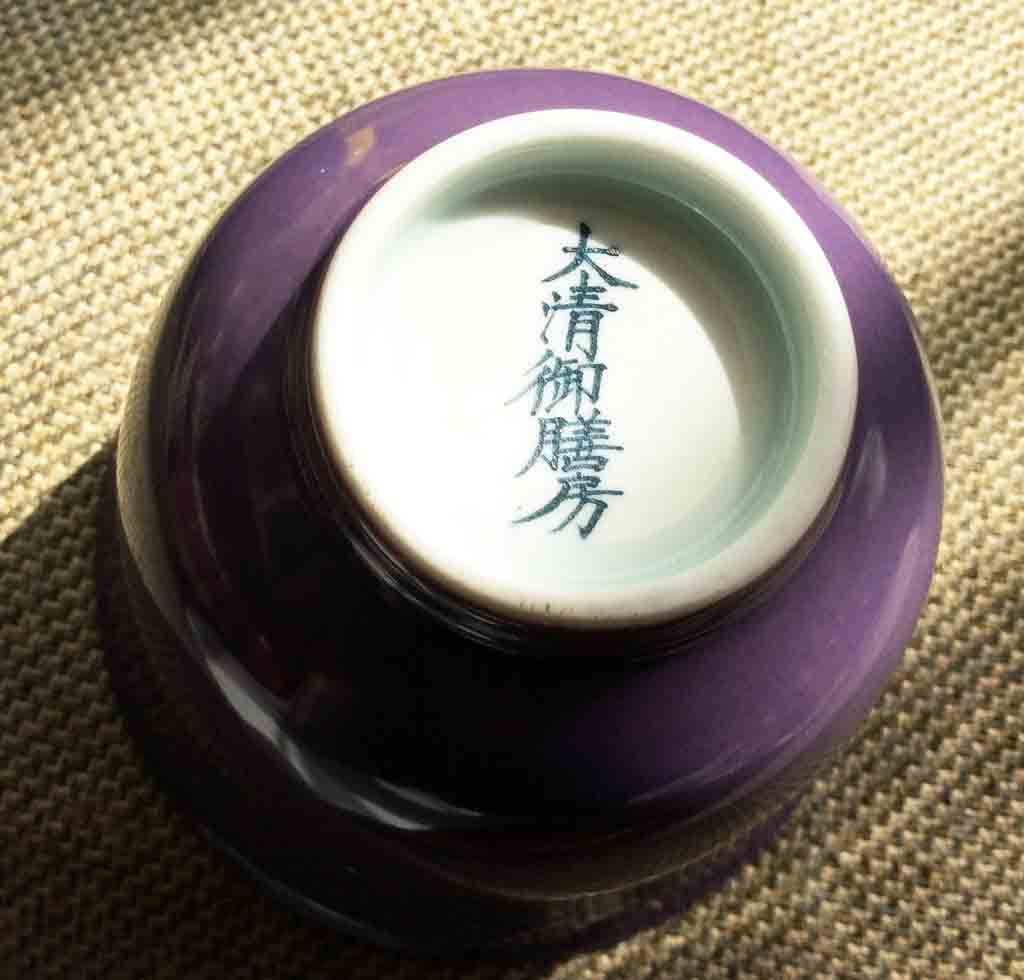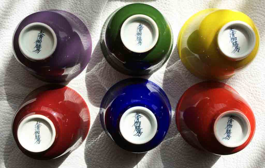 另外,偶然發現「大清御膳房」款單色釉壓手茶杯,大約在七個月之前初次看到這霽藍、霽(寶石)紅兩種顏色的「大清御膳房」款單色釉壓手茶杯,當時只覺得漂亮、亮眼,有古味,「大清御膳房」款還是用青花墨彩手寫的。當時有人估價數萬元新台幣,隔了兩個月,估價人在網路上找到類似的,推估是民國初年的仿品,因此我認為新台幣2000元是我可以接受的價錢。沒想到在光華玉市看到這樣的「大清御膳房」款單色釉壓手茶杯,在一個攤位發現四種顏色,在另一個攤位發現另外兩種顏色,合起來有六種顏色,後來經過探詢得知共有七種顏色,要等到過完年再補新貨時才可能補齊七種顏色。至於價格,比我心理預期的價格低了許多,在洗淨、煮過、擺在桌上喝茶時,人人見到都忍不住要稱讚幾句。