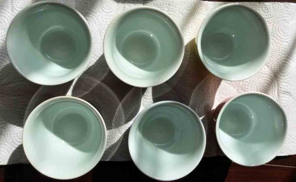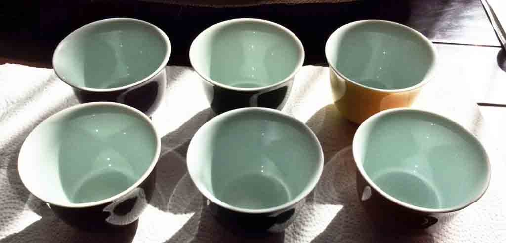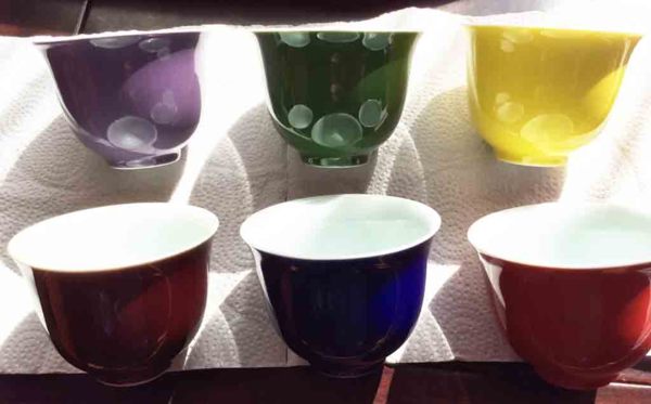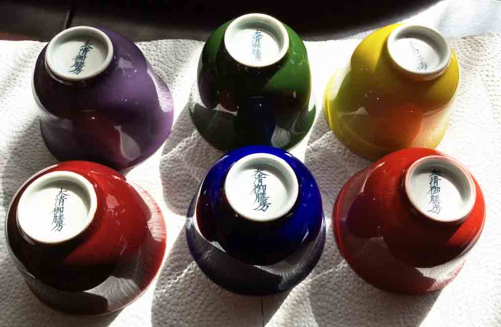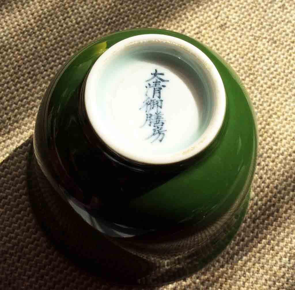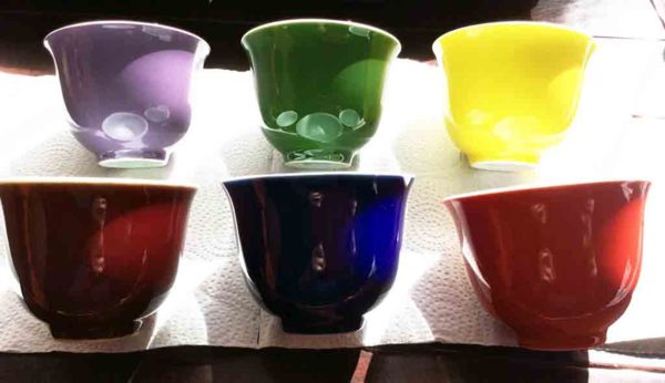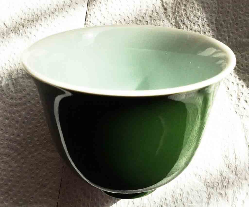 另外,偶然發現「大清御膳房」款單色釉壓手茶杯,大約在七個月之前初次看到這霽藍、霽(寶石)紅兩種顏色的「大清御膳房」款單色釉壓手茶杯,當時只覺得漂亮、亮眼,有古味,「大清御膳房」款還是用青花墨彩手寫的。當時有人估價數萬元新台幣,隔了兩個月,估價人在網路上找到類似的,推估是民國初年的仿品,因此我認為新台幣2000元是我可以接受的價錢。沒想到在光華玉市看到這樣的「大清御膳房」款單色釉壓手茶杯,在一個攤位發現四種顏色,在另一個攤位發現另外兩種顏色,合起來有六種顏色,後來經過探詢得知共有七種顏色,要等到過完年再補新貨時才可能補齊七種顏色。至於價格,比我心理預期的價格低了許多,在洗淨、煮過、擺在桌上喝茶時,人人見到都忍不住要稱讚幾句。