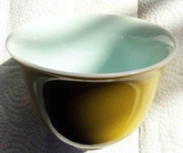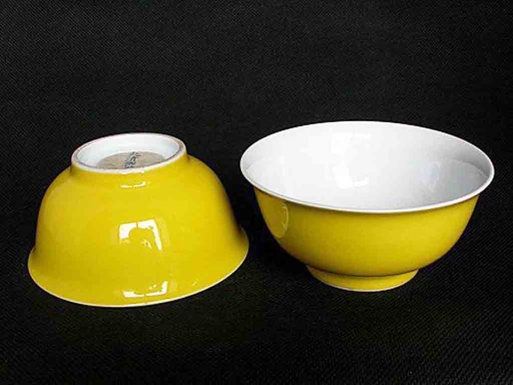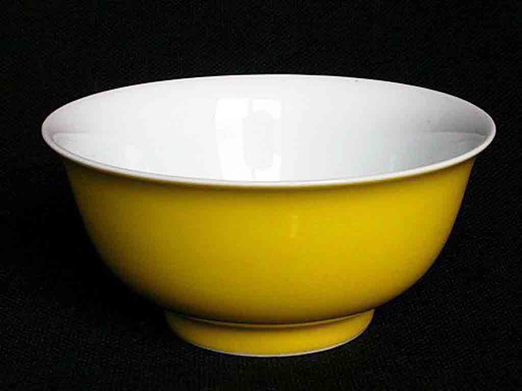4.釉色:碗內施白釉,外施淡黃釉,釉色純正,白釉略帶鴨蛋殼青白色,並帶有幾點細微煙灰,由此特徵判斷應為柴窯所燒,若為現代瓦斯窯或電窯燒製,釉色為較純白及乾淨。