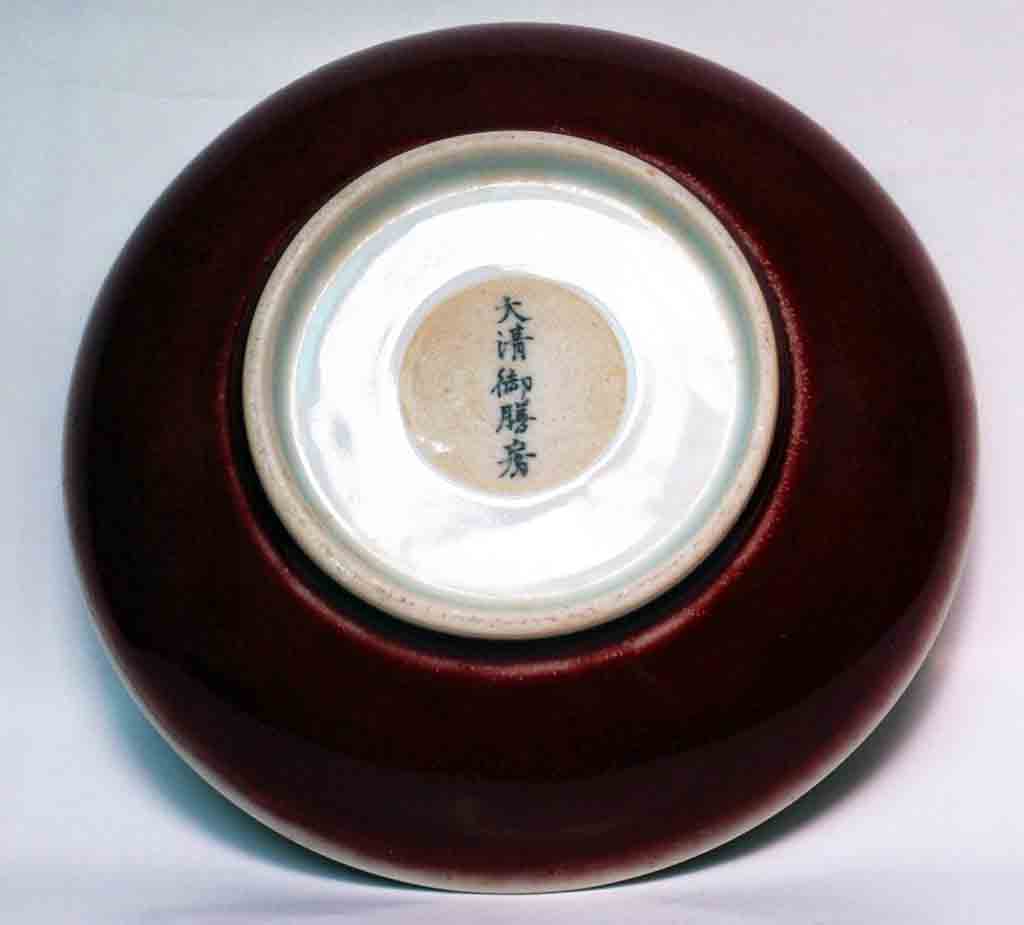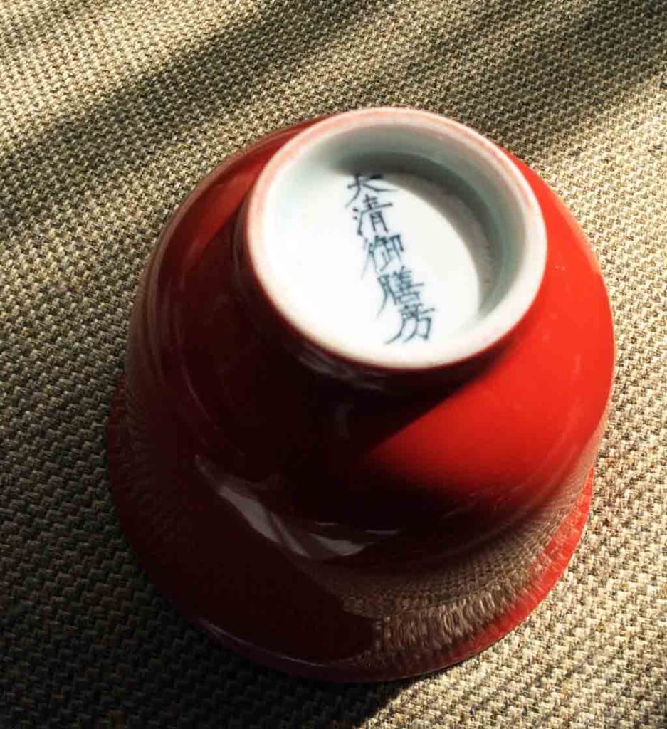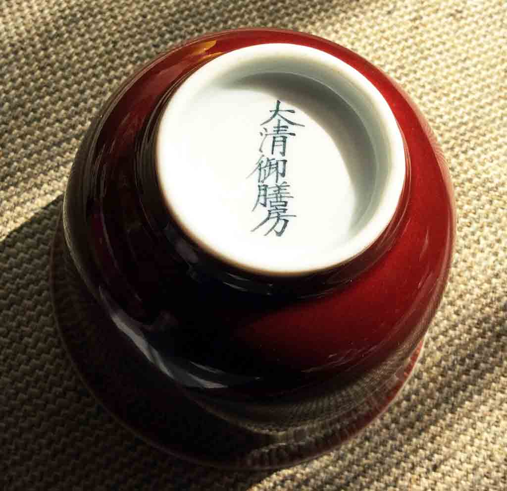 回家後拿出所有瓷器書籍均查不到此”大清御膳房”款式,後來上網,在正式官方及專家瓷器資料也找不到”大清御膳房”款式資料,只在私人部落格找到一件”大清御膳房”款,類似撇口碗造型的紅釉碗。若是真款,則中寶買到清宮御用官窯。若是偽款,應是民初精仿製品,仍有其價值在,以此價位購得應無損失。