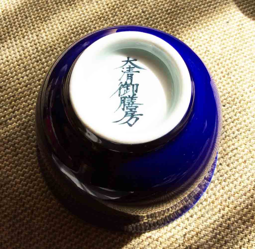 6.款識:碗底為施白釉中心露一圓形素胎,內以深藍琺瑯彩手書單行小楷“大清御膳房”款,字體俊秀工整。此種露胎作法及款式,收藏瓷器近30年從未見過。