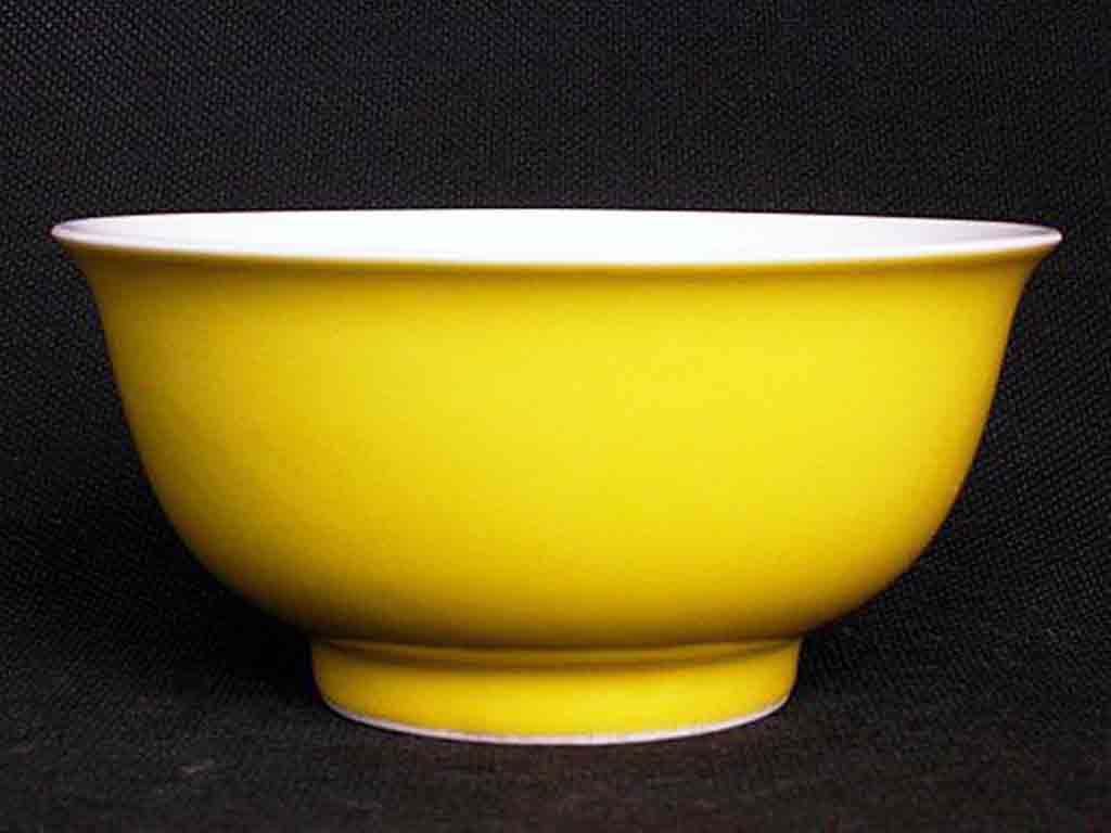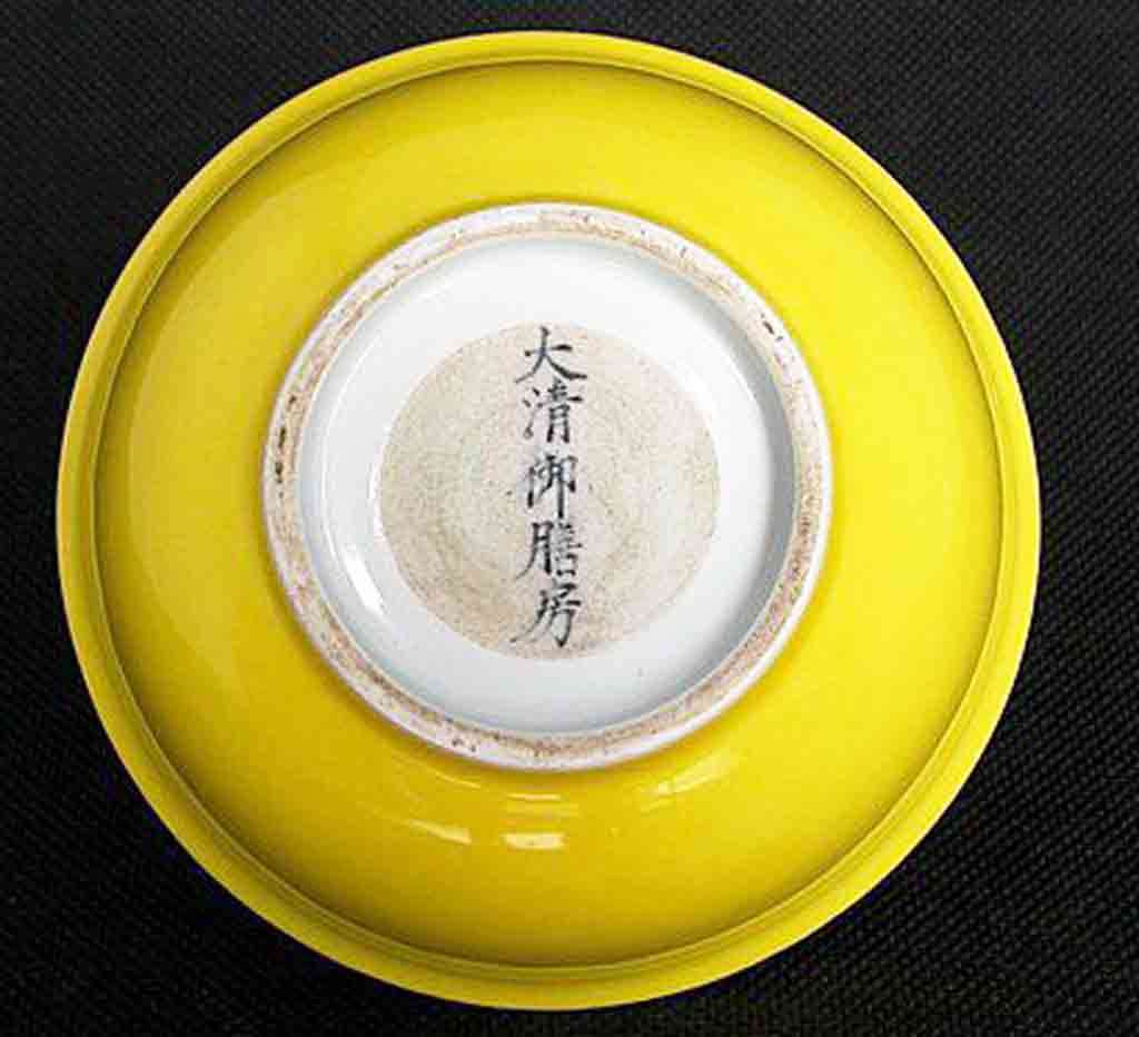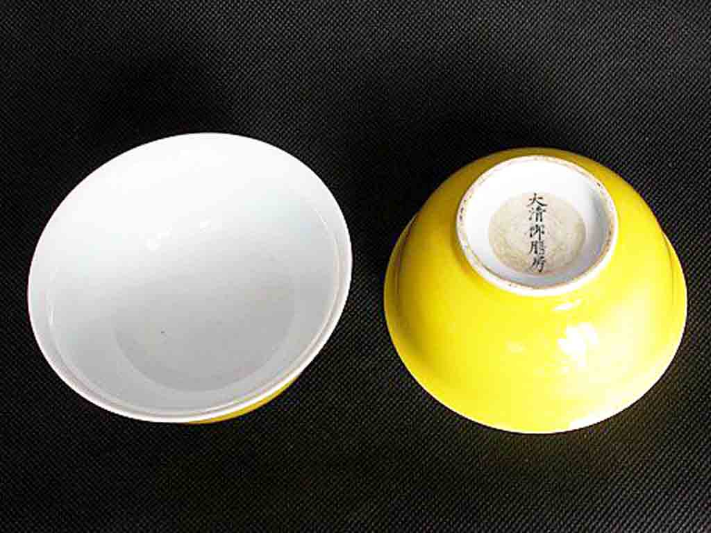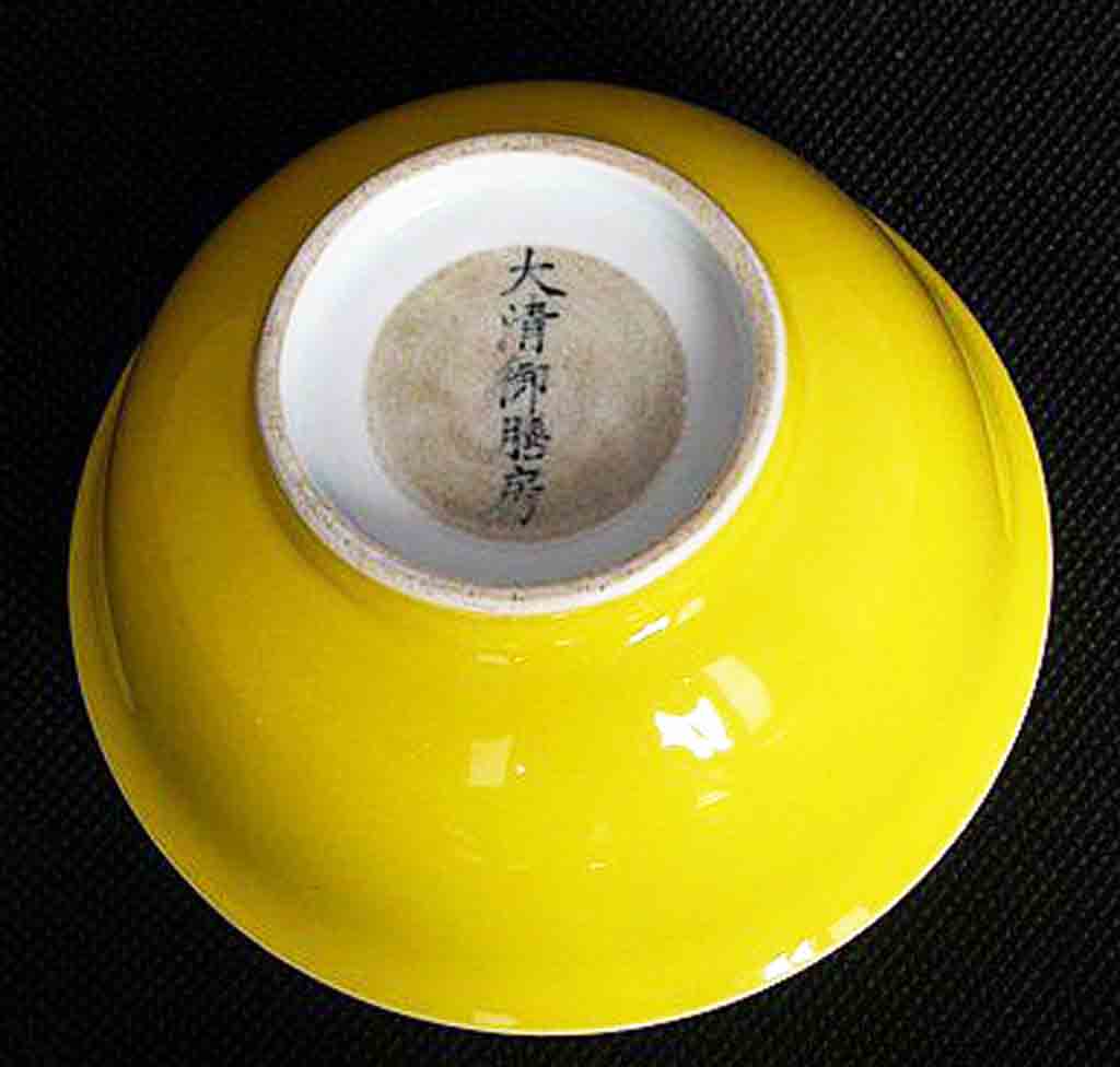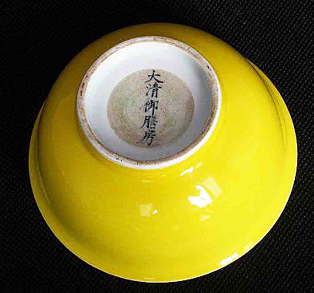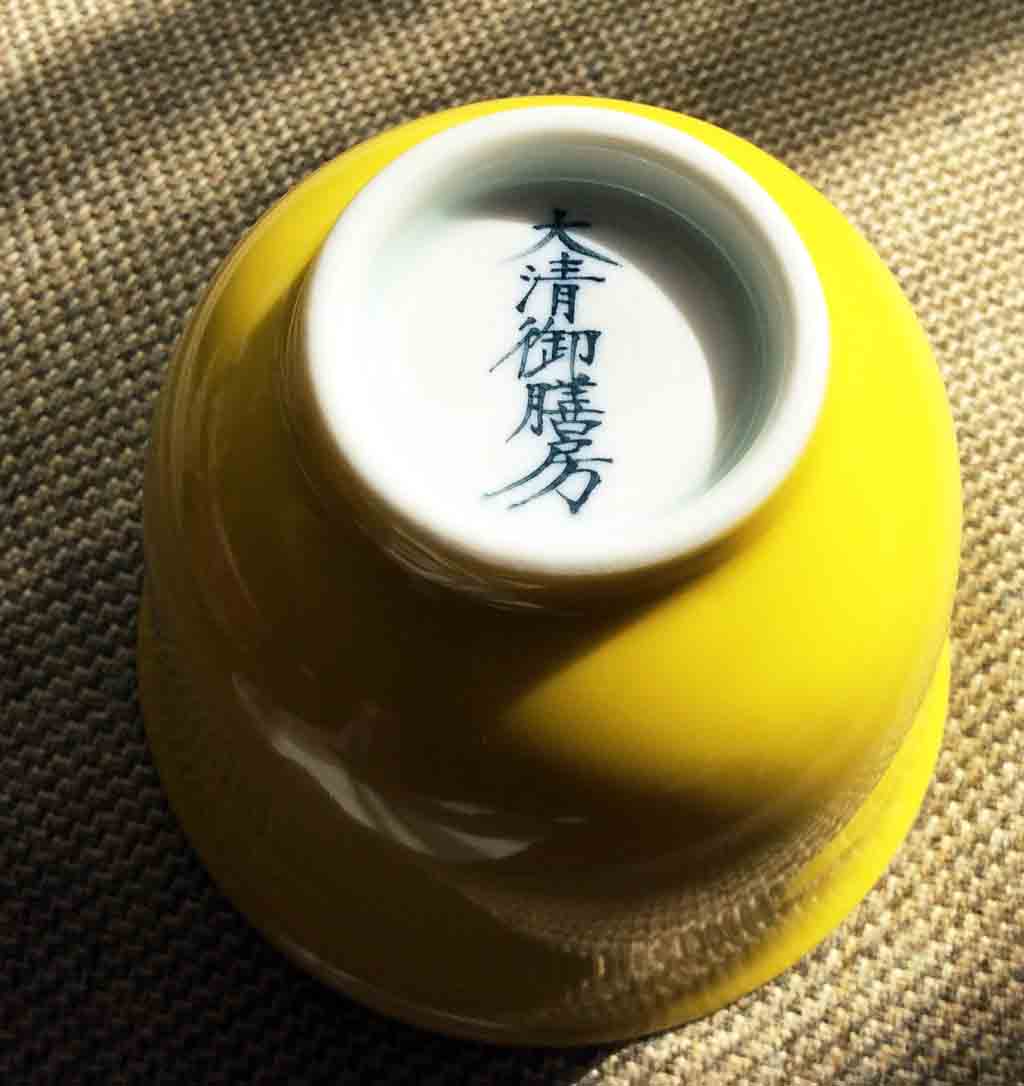(2010.9.25)本週六玉市文物之旅逛到其攤位上,大致瀏覽其桌面所陳列文物,大多數是之前見過,少數未見過,也沒有值得上手後再詢問其價位的。於是問其還有沒有擺出來的?他表示有帶來一對”大清御膳房”款黃釉碗,為其父親十幾年前的藏品,因近來找不到老瓷器,才拿出來賣。我說有興趣,於是他從桌面下行李袋拿出來供我鑑賞。我看造型是撇口碗,線條優美,碗內施白釉,外施黃釉,釉色純正,釉面光亮瑩潤。表面散發出的光擇是溫潤柔和寶光,而非新仿之賊光,以手去觸摸有滑順不留手感,並沒有新仿的澀手滯手感,這是老件瓷器才有的特徵。整體看有官窯氣象,但翻看碗底為施白釉中心露一圓形素胎,內書單行小楷“大清御膳房”款。此種露胎作法及款式從未見過,不得不讓我慎重其事,逐一檢視比對,根據造型、胎土、底足、釉色、釉面及款式各方面逐項詳細檢視: