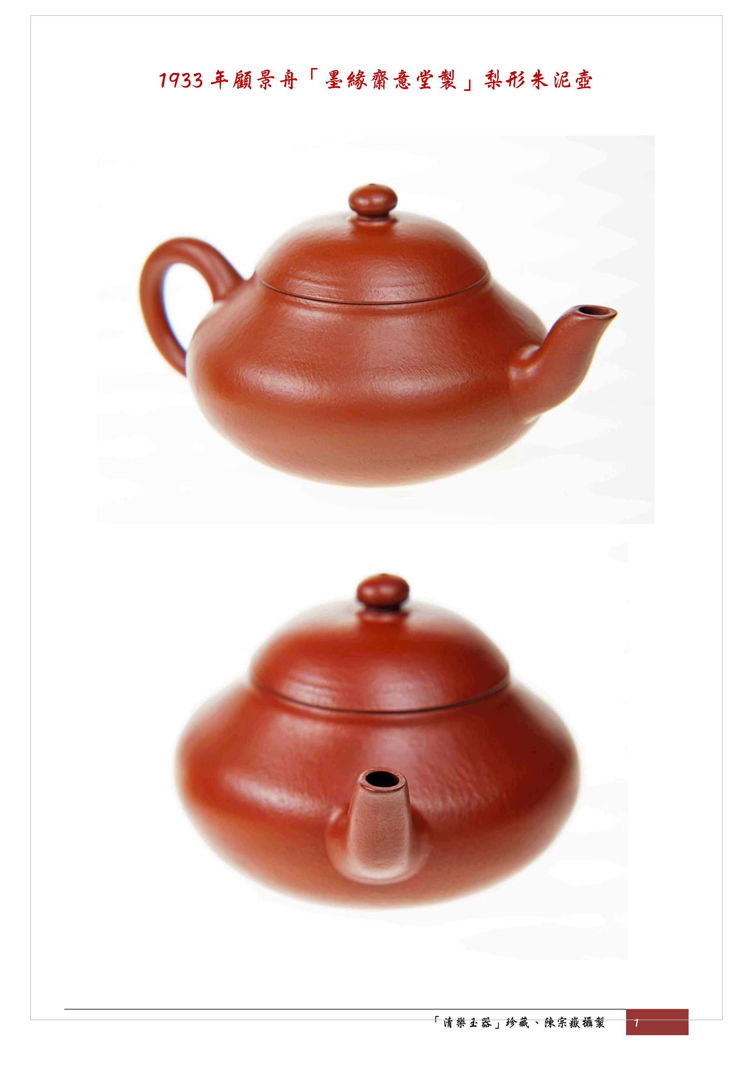 1933年顧景舟「墨緣齋意堂製」梨形朱泥壺
