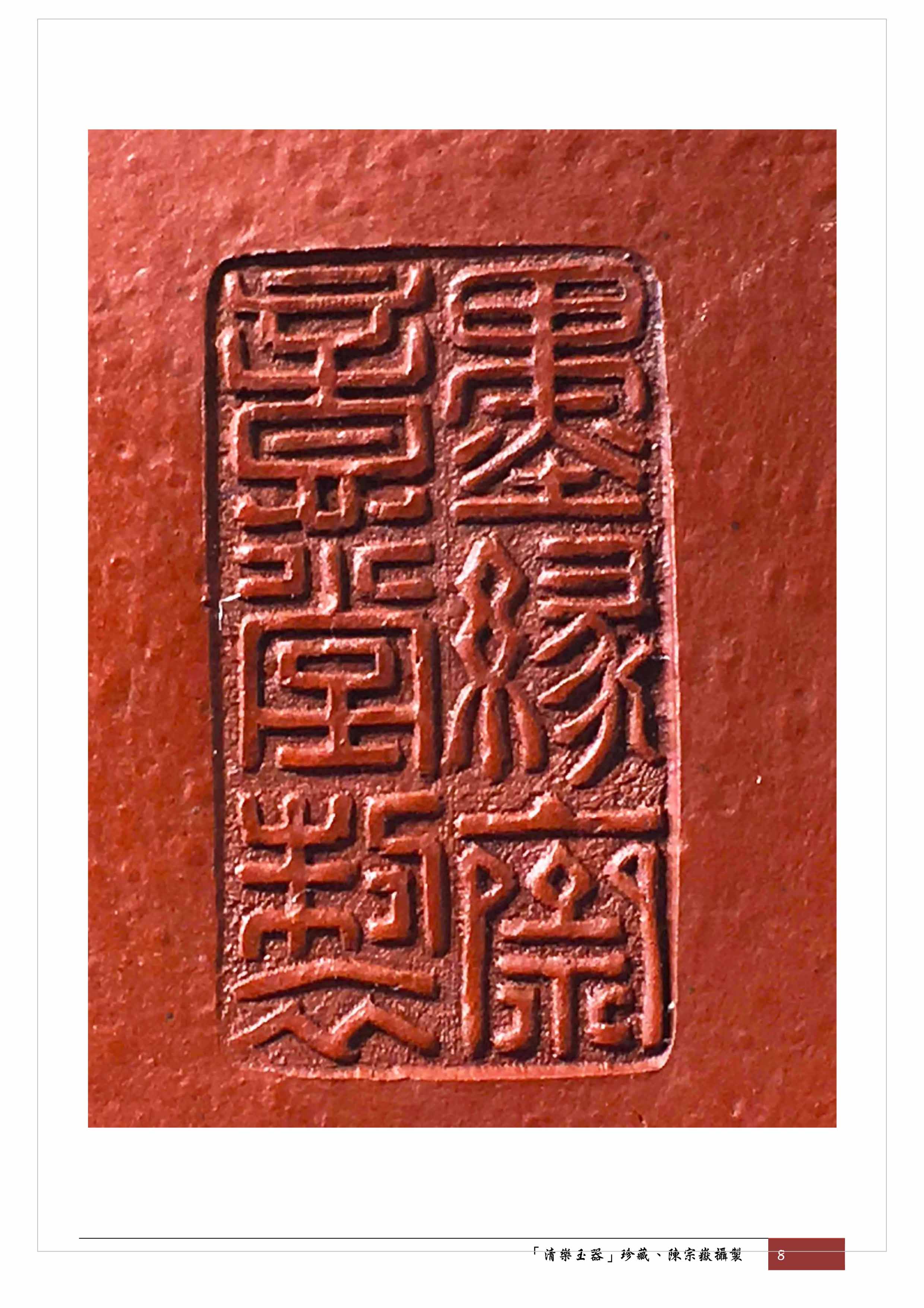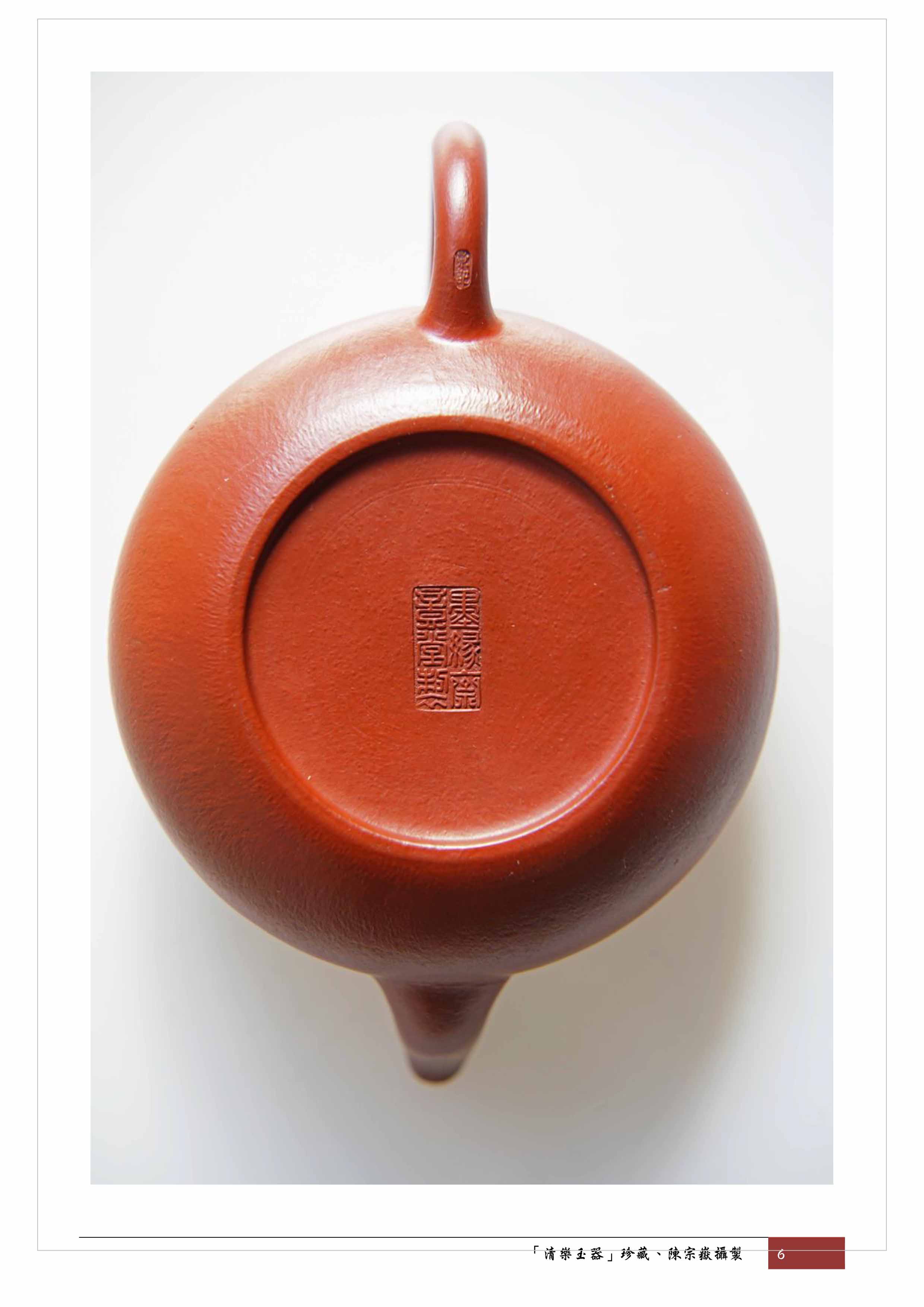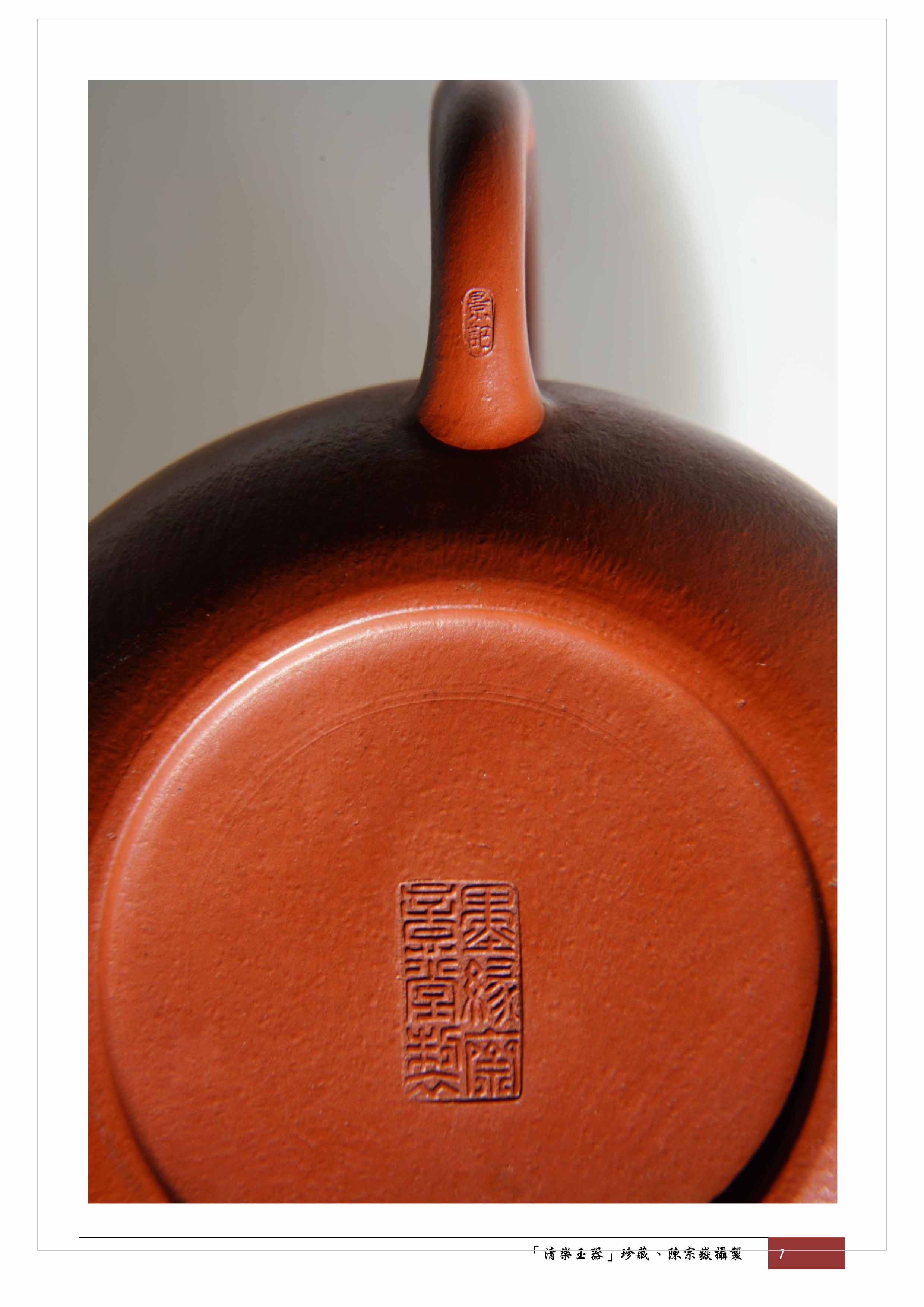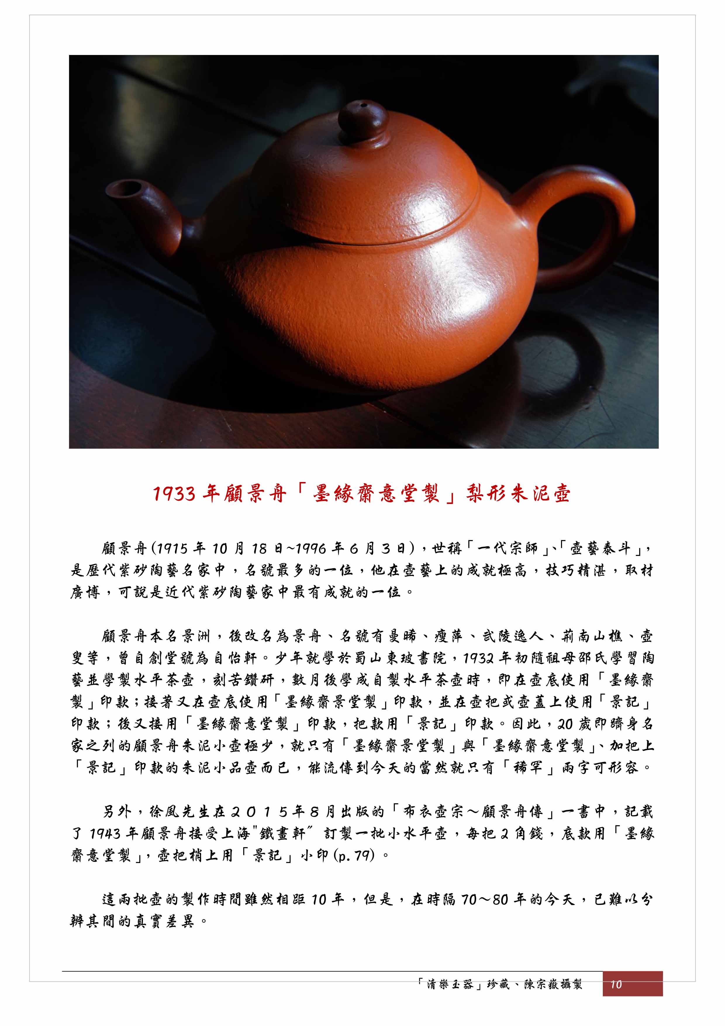 另外,徐風先生在2015年8月出版的「布衣壺宗~顧景舟傳」一書中,記載了1943年顧景舟接受上海"鐵畫軒〞訂製一批小水平壺,每把2角錢,底款用「墨緣齋意堂製」,壺把梢上用「景記」小印(p.79)。