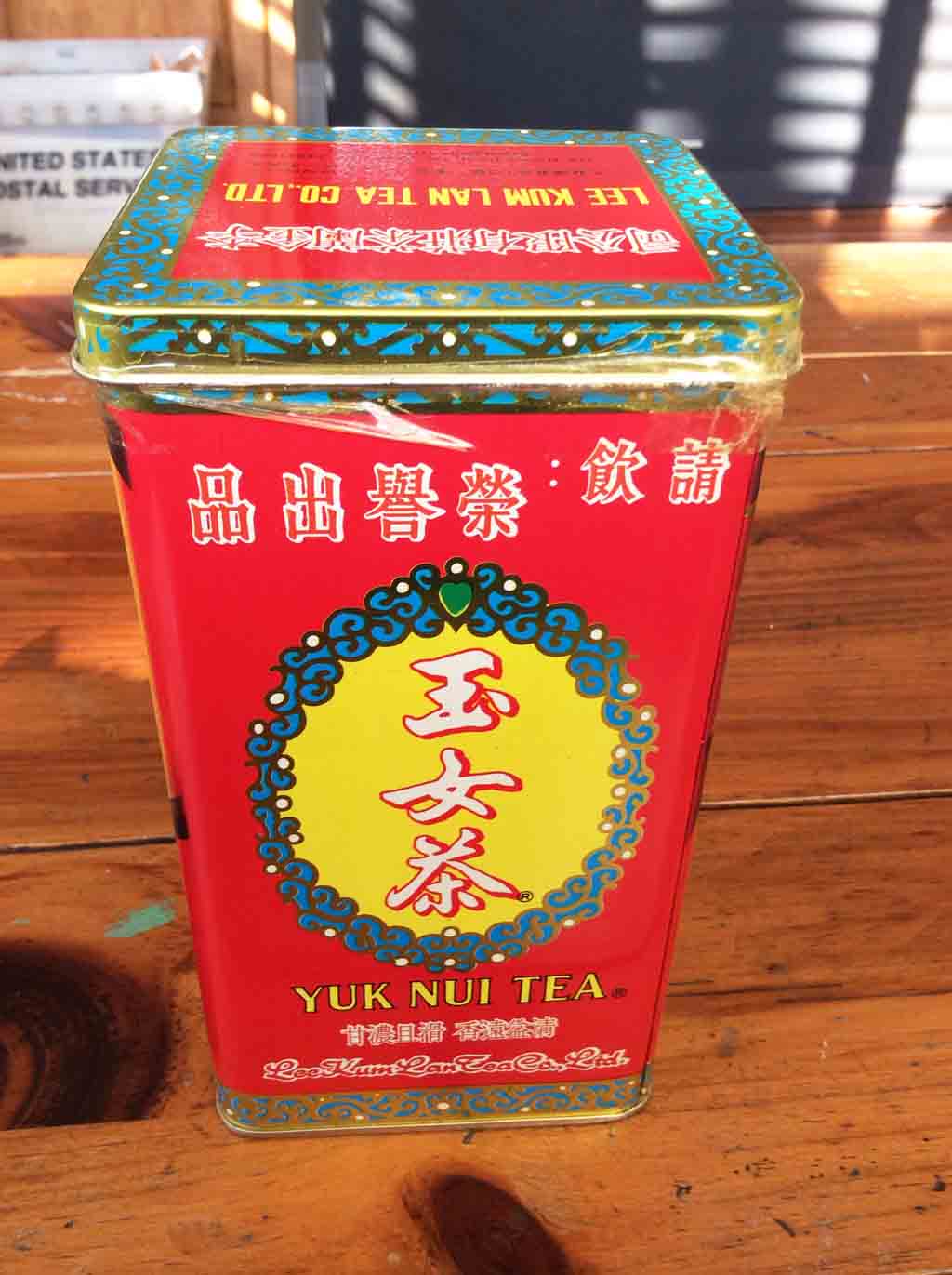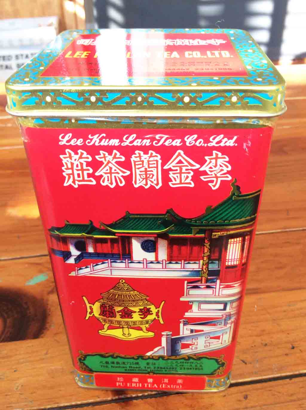 2014年2月5日獲親戚贈予李金蘭茶莊玉女茶一盒,年代看來甚久的鐵盒上,以貼紙標註著的珍藏普洱茶,2月8日下午新春第一次品茶時,特開罐審視,應是熟普洱散茶,只是確定的製造年代還待評估,且待2月15日下午品嘗茶味後再論。