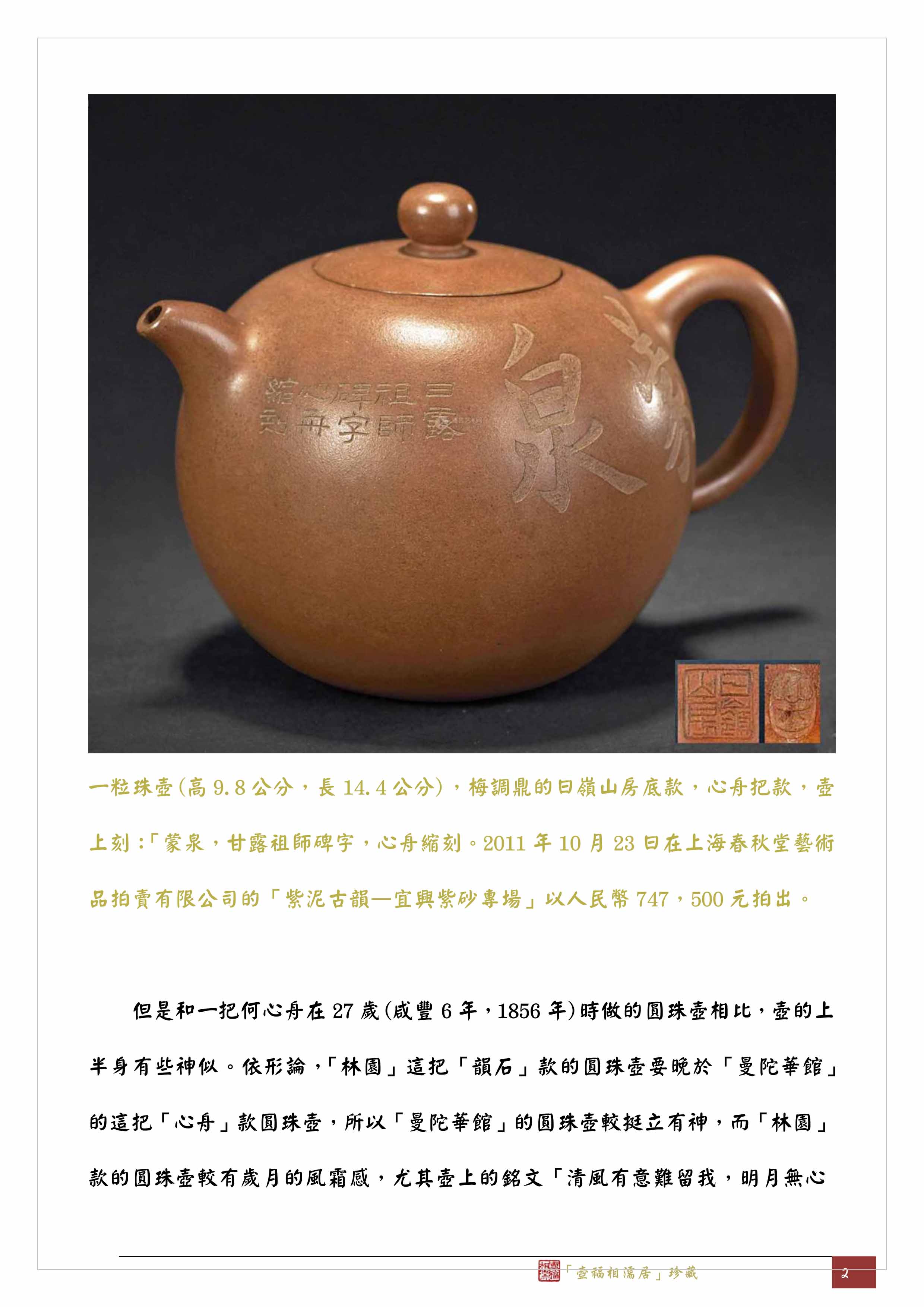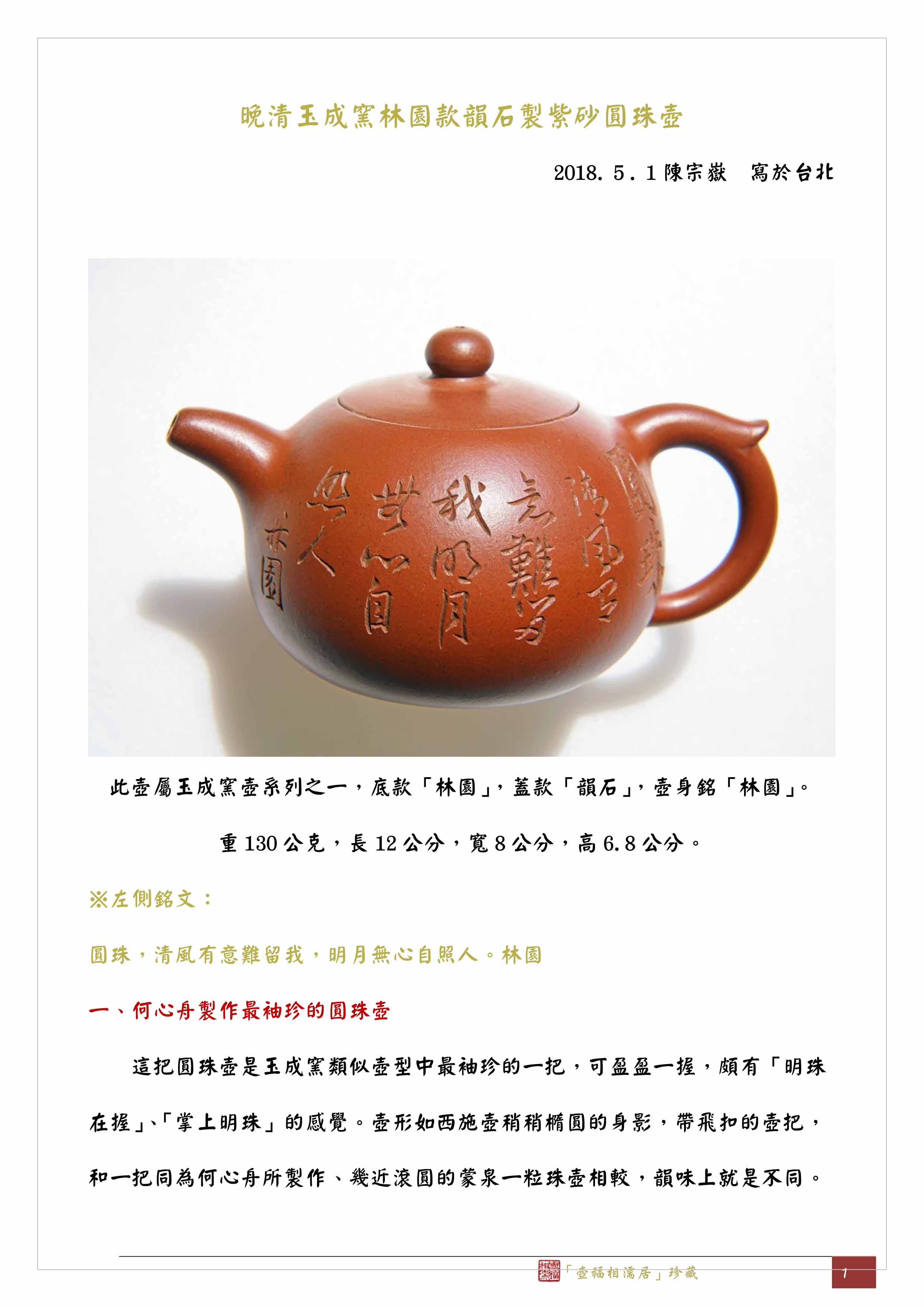 這把圓珠壺的款印有三個:底款「林園」,蓋款「韻石」,壺身「林園」。其中「韻石」是何心舟的號,至於「林園」是不是和目前認定的「曼陀華館」一樣是何心舟的齋名,我個人存有疑慮,因為以往沒有文人使用像「林園」這樣只有園名、沒有主角的齋堂號,而且「林園」是因為玉成窯的窯址設在寧波慈城林家花園內的一隅而得名,因此我以為「林園」更像一個雅集聚會或類似作坊的群組名稱,所以玉成窯的主角梅調鼎在光緒23(1897)年9月的一對條幅上寫道:「詩書敦夙好,林園無俗情。光緒廿三年九月,赧翁漫筆」。
