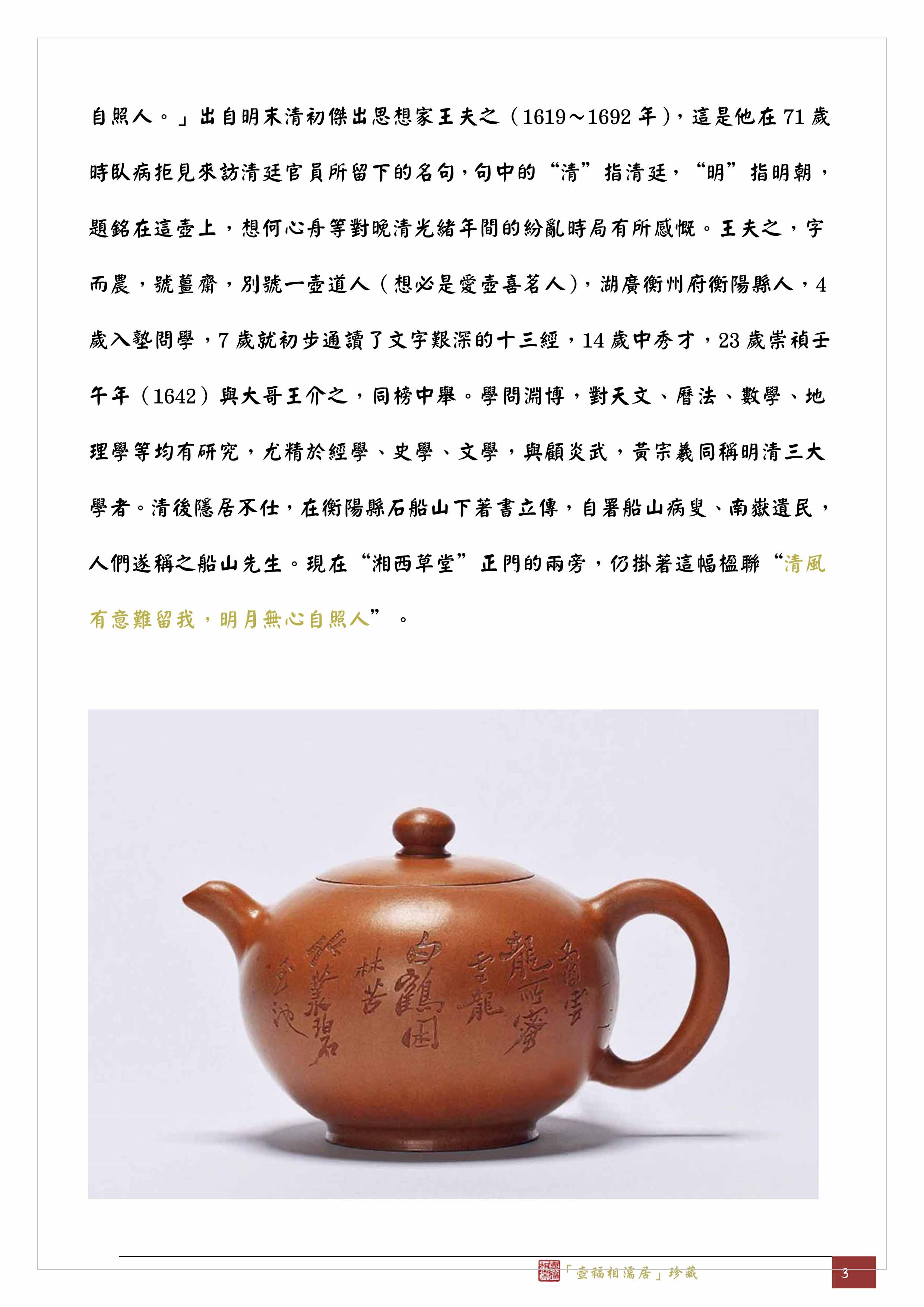 但是和一把何心舟在27歲(咸豐6年,1856年)時做的圓珠壺相比,壺的上半身有些神似。依形論,「林園」這把「韻石」款的圓珠壺要晚於「曼陀華館」的這把「心舟」款圓珠壺,所以「曼陀華館」的圓珠壺較挺立有神,而「林園」款的圓珠壺較有歲月的風霜感,尤其壺上的銘文「清風有意難留我,明月無心自照人。」出自明末清初傑出思想家王夫之(1619~1692年),這是他在71歲時臥病拒見來訪清廷官員所留下的名句,句中的“清”指清廷,“明”指明朝,題銘在這壺上,想何心舟等對晚清光緒年間的紛亂時局有所感慨。王夫之,字而農,號薑齋,別號一壺道人(想必是愛壺喜茗人),湖廣衡州府衡陽縣人,4歲入塾問學,7歲就初步通讀了文字艱深的十三經,14歲中秀才,23歲崇禎壬午年(1642)與大哥王介之,同榜中舉。學問淵博,對天文、曆法、數學、地理學等均有研究,尤精於經學、史學、文學,與顧炎武,黃宗羲同稱明清三大學者。清後隱居不仕,在衡陽縣石船山下著書立傳,自署船山病叟、南嶽遺民,人們遂稱之船山先生。現在“湘西草堂”正門的兩旁,仍掛著這幅楹聯“清風有意難留我,明月無心自照人”。