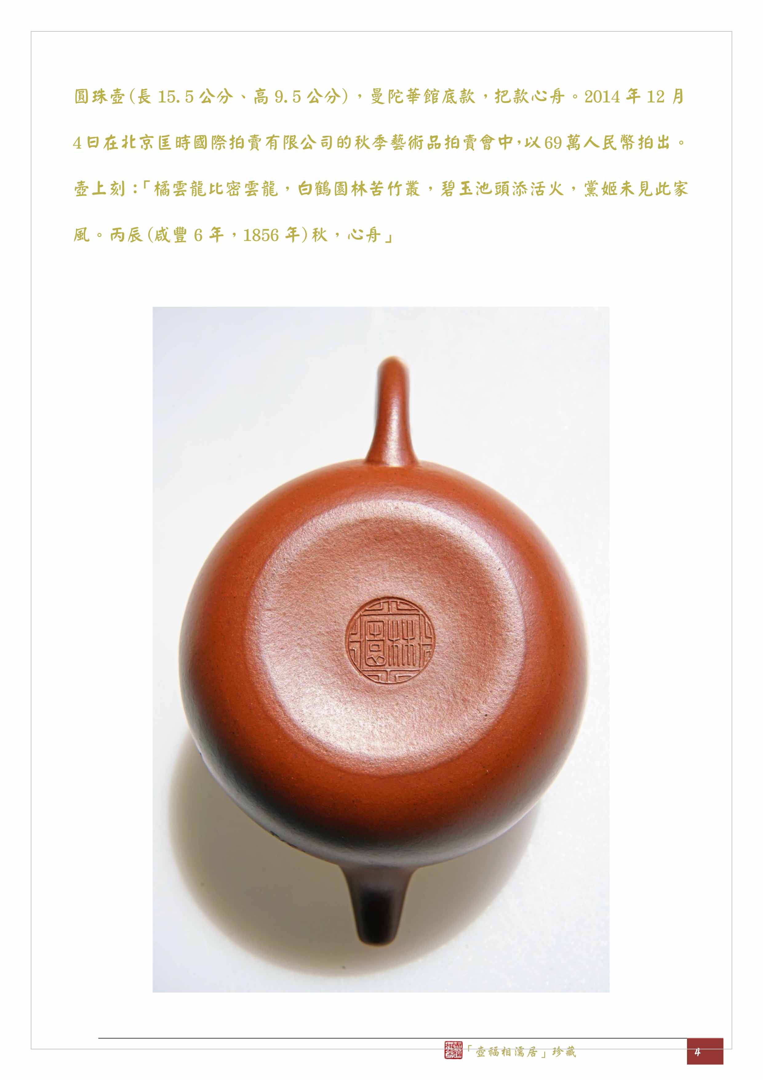 圓珠壺(長15.5公分、高9.5公分),曼陀華館底款,把款心舟。2014年12月4日在北京匡時國際拍賣有限公司的秋季藝術品拍賣會中,以69萬人民幣拍出。壺上刻:「橘雲龍比密雲龍,白鶴園林苦竹叢,碧玉池頭添活火,黨姬未見此家風。丙辰(咸豐6年,1856年)秋,心舟」