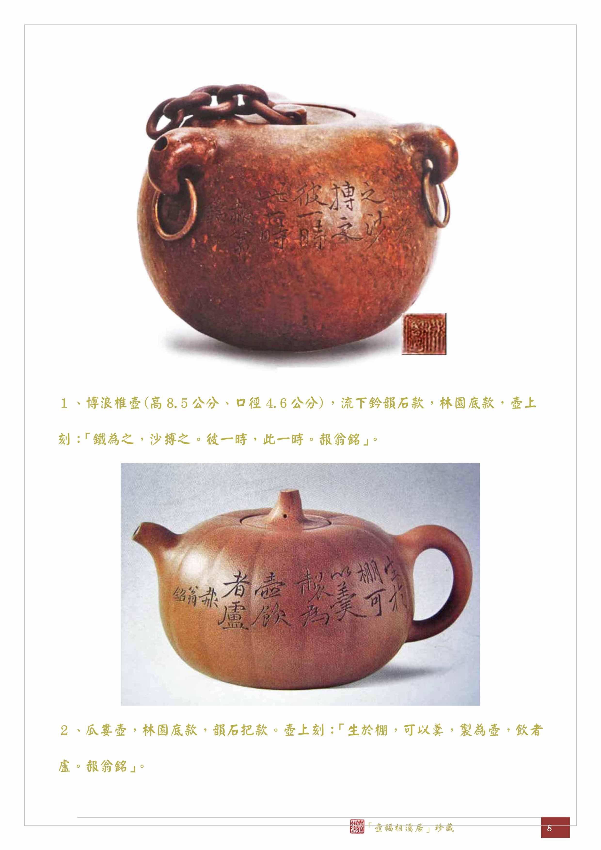 1、博浪椎壺(高8.5公分、口徑4.6公分),流下鈐韻石款,林園底款,壺上刻:「鐵為之,沙搏之。彼一時,此一時。赧翁銘」。