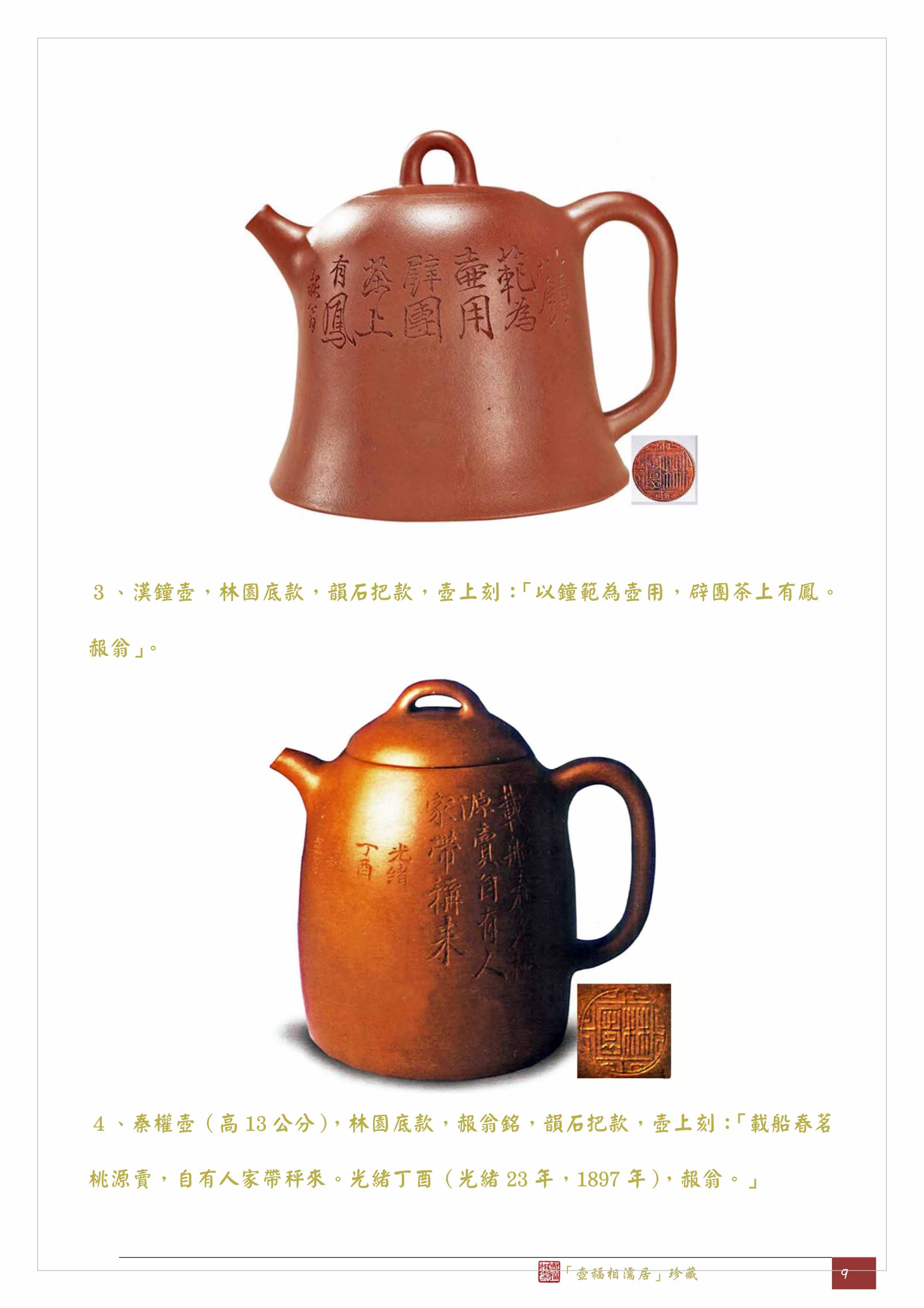 3、漢鐘壺,林園底款,韻石把款,壺上刻:「以鐘範為壺用,辟團茶上有鳳。赧翁」。