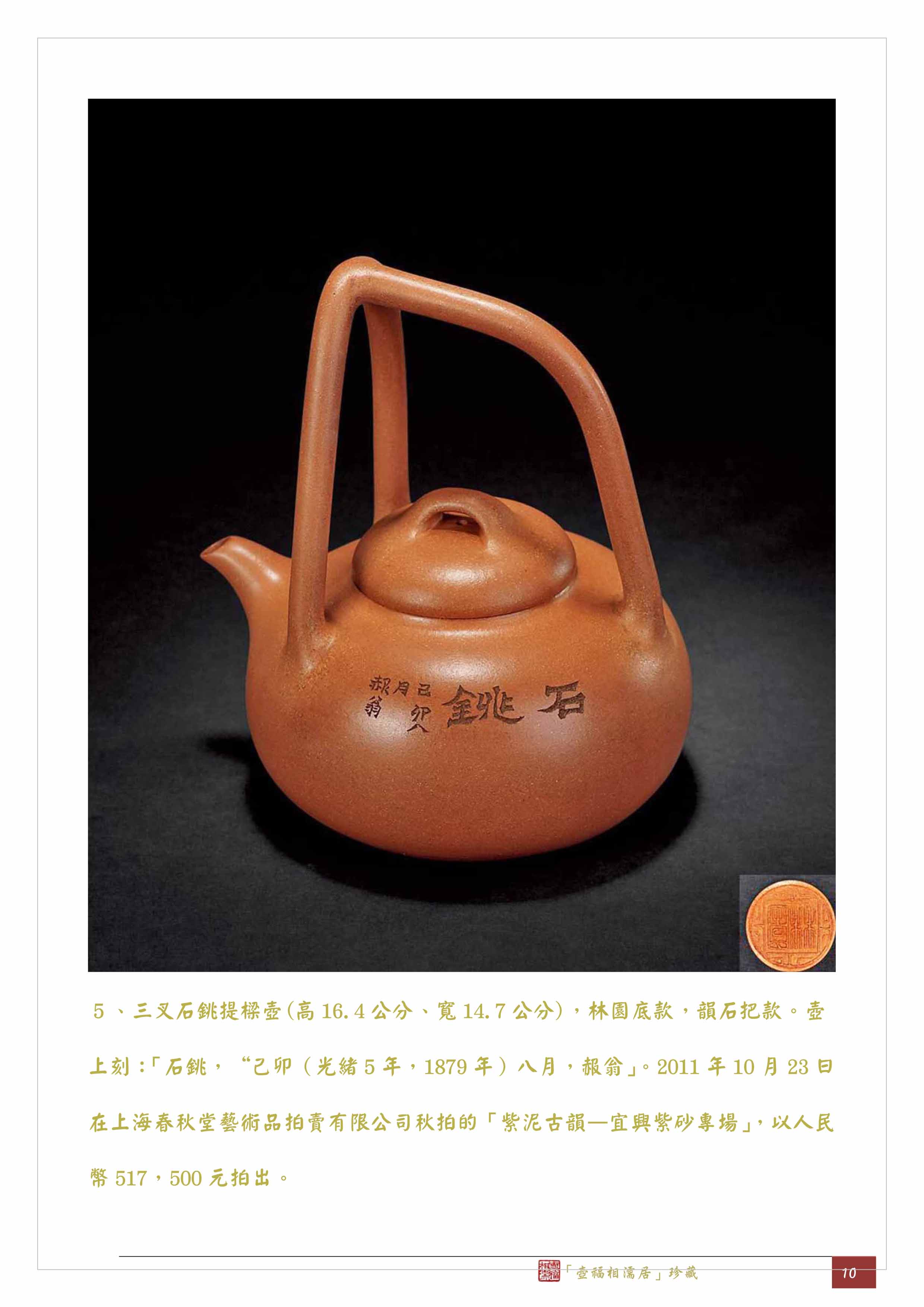 5、三叉石銚提樑壺(高16.4公分、寬14.7公分),林園底款,韻石把款。壺上刻:「石銚,“己卯(光緒5年,1879年)八月,赧翁」。2011年10月23日在上海春秋堂藝術品拍賣有限公司秋拍的「紫泥古韻—宜興紫砂專場」,以人民幣517,500元拍出。